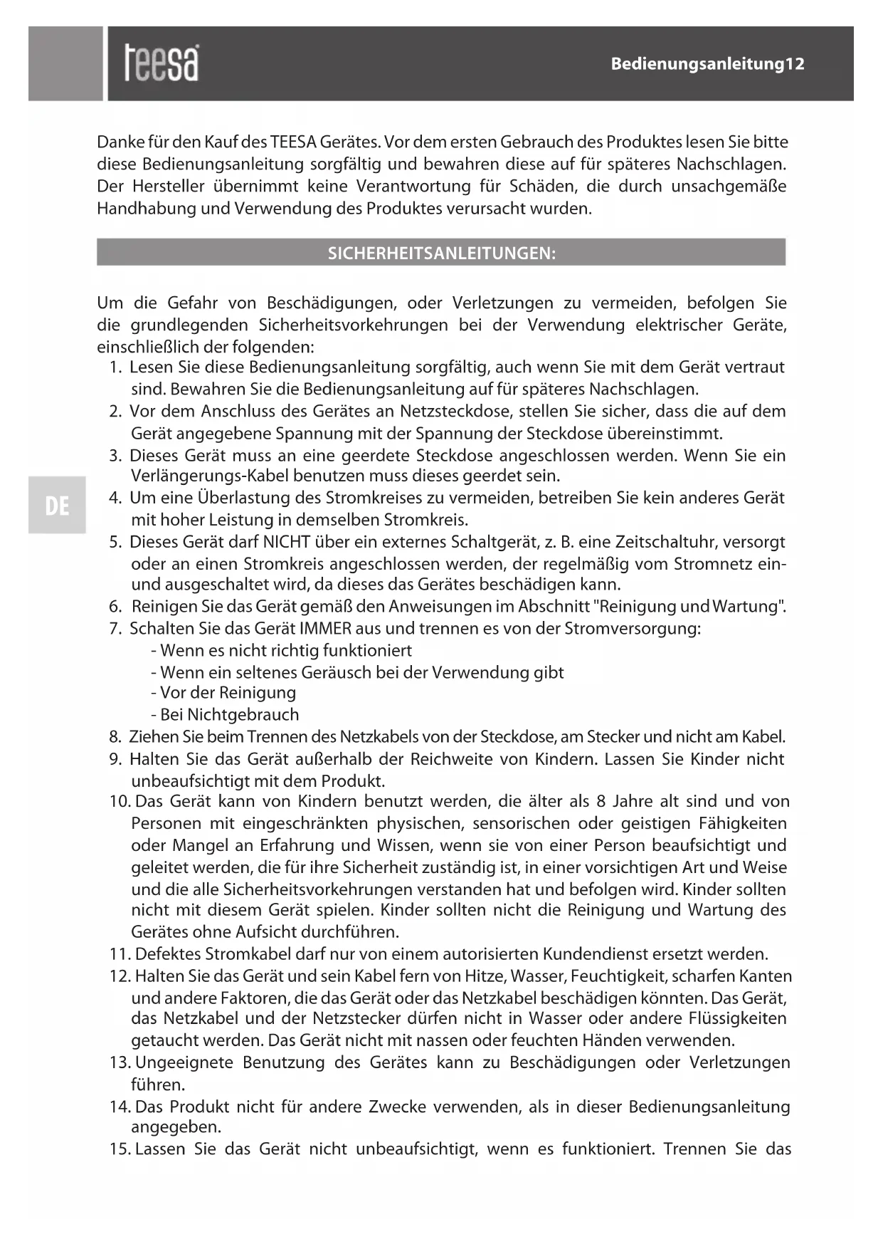 - Obsahuje: žehličku, nádobu na nalití vodyDE Bedienungsanleitung12 Danke für den Kauf des TEESA Gerätes. Vor dem ersten Gebrauch des Produktes lesen Sie bitte diese Bedienungsanleitung sorgfältig und bewahren diese auf für späteres Nachschlagen. Der Hersteller übernimmt keine Verantwortung für Schäden, die durch unsachgemäße Handhabung und Verwendung des Produktes verursacht wurden. SICHERHEITSANLEITUNGEN: Um die Gefahr von Beschädigungen, oder Verletzungen zu vermeiden, befolgen Sie die grundlegenden Sicherheitsvorkehrungen bei der Verwendung elektrischer Geräte, einschließlich der folgenden: