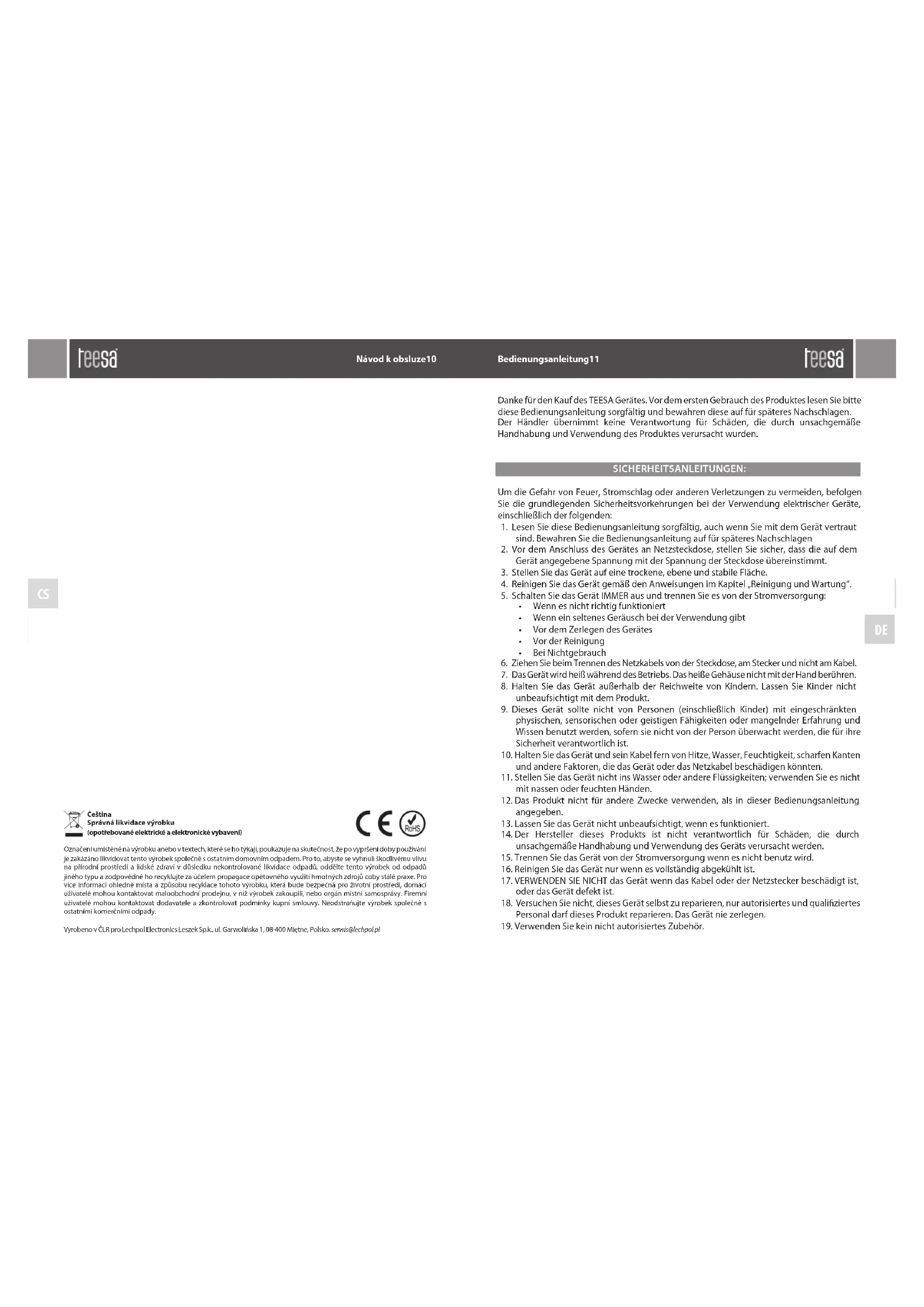 Návod k obsluze10 Danke für den Kauf des TEESA Gerätes. Vor dem ersten Gebrauch des Produktes lesen Sie bitte diese Bedienungsanleitung sorgfältig und bewahren diese auf für späteres Nachschlagen. Der Händler übernimmt keine Verantwortung für Schäden, die durch unsachgemäße Handhabung und Verwendung des Produktes verursacht wurden. SICHERHEITSANLEITUNGEN: Um die Gefahr von Feuer, Stromschlag oder anderen Verletzungen zu vermeiden, befolgen Sie die grundlegenden Sicherheitsvorkehrungen bei der Verwendung elektrischer Geräte, einschließlich der folgenden: