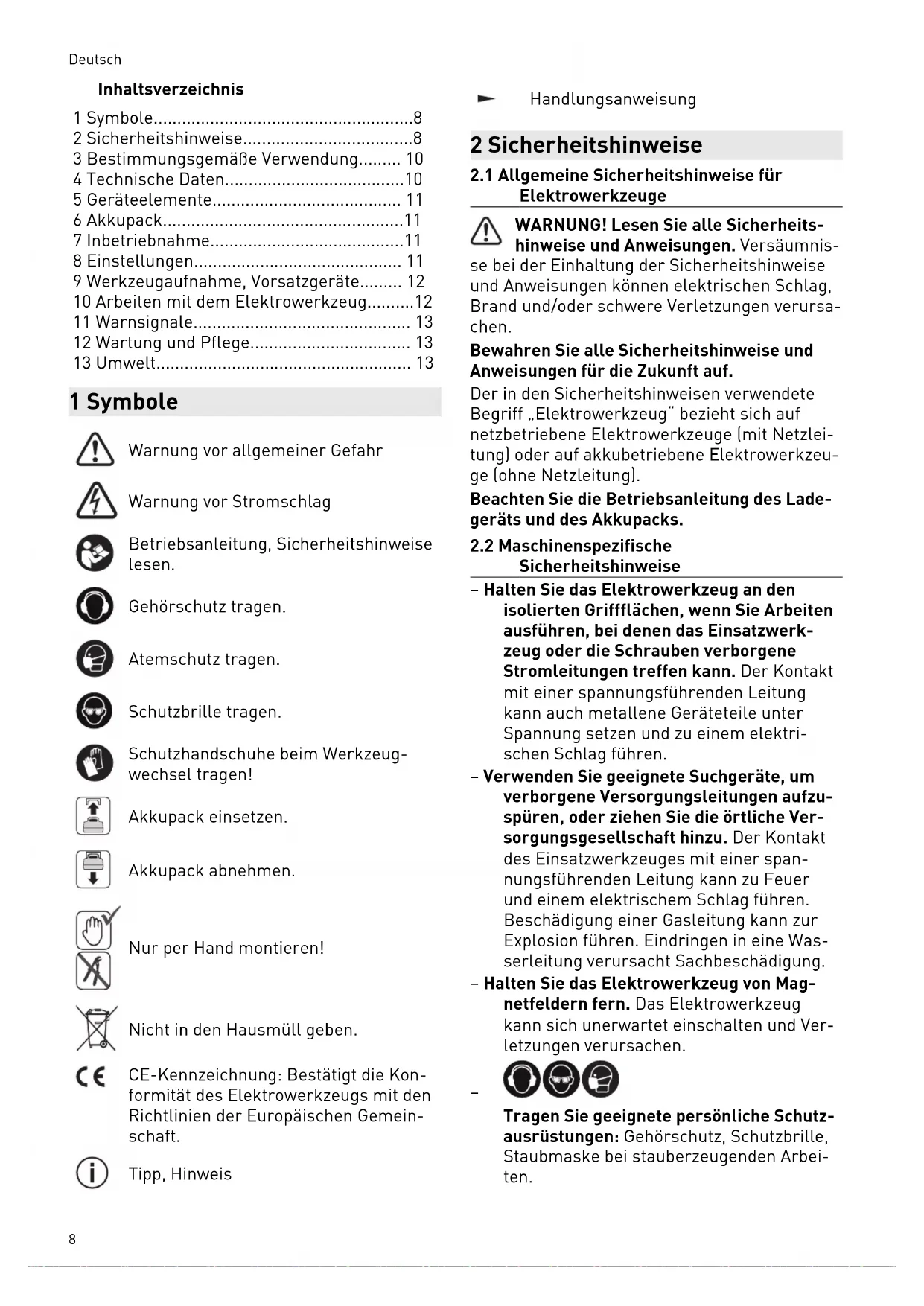 - 13 Umwelt 1 Symbole Warnung vor allgemeiner Gefahr Warnung vor Stromschlag Betriebsanleitung, Sicherheitshinweise lesen. Gehörschutz tragen. Atemschutz tragen. Schutzbrille tragen. Schutzhandschuhe beim Werkzeug wechsel tragen! Akkupack einsetzen. Akkupack abnehmen. Nur per Hand montieren! Nicht in den Hausmüll geben. CE-Kennzeichnung: Bestätigt die Kon formität des Elektrowerkzeugs mit den Richtlinien der Europäischen Gemein schaft. Tipp, Hinweis Handlungsanweisung 2 Sicherheitshinweise p. 13