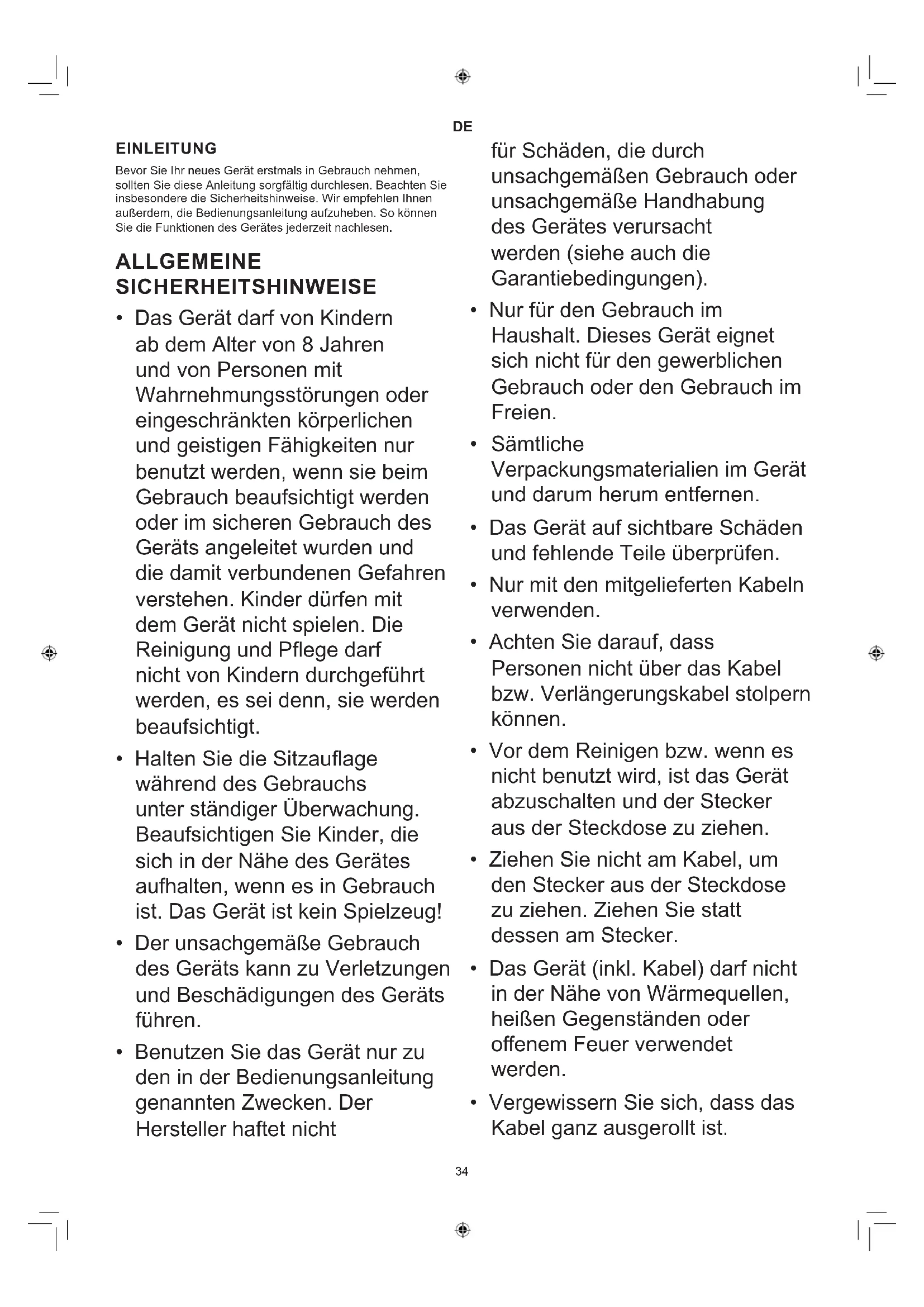 EINLEITUNG Bevor Sie Ihr neues Gerät erstmals in Gebrauch nehmen, sollten Sie diese Anleitung sorgfältig durchlesen. Beachten Sie insbesondere die Sicherheitshinweise. Wir empfehlen Ihnen außerdem, die Bedienungsanleitung aufzuheben. So können Sie die Funktionen des Gerätes jederzeit nachlesen. ALLGEMEINE SICHERHEITSHINWEISE