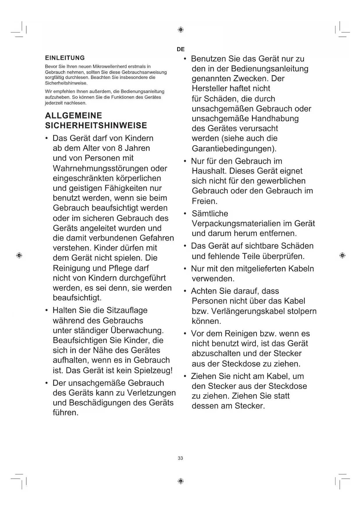 EINLEITUNG Bevor Sie Ihren neuen Mikrowellenherd erstmals in Gebrauch nehmen, sollten Sie diese Gebrauchsanweisung sorgfältig durchlesen. Beachten Sie insbesondere die Sicherheitshinweise. Wir empfehlen Ihnen außerdem, die Bedienungsanleitung aufzuheben. So können Sie die Funktionen des Gerätes jederzeit nachlesen. ALLGEMEINE SICHERHEITSHINWEISE