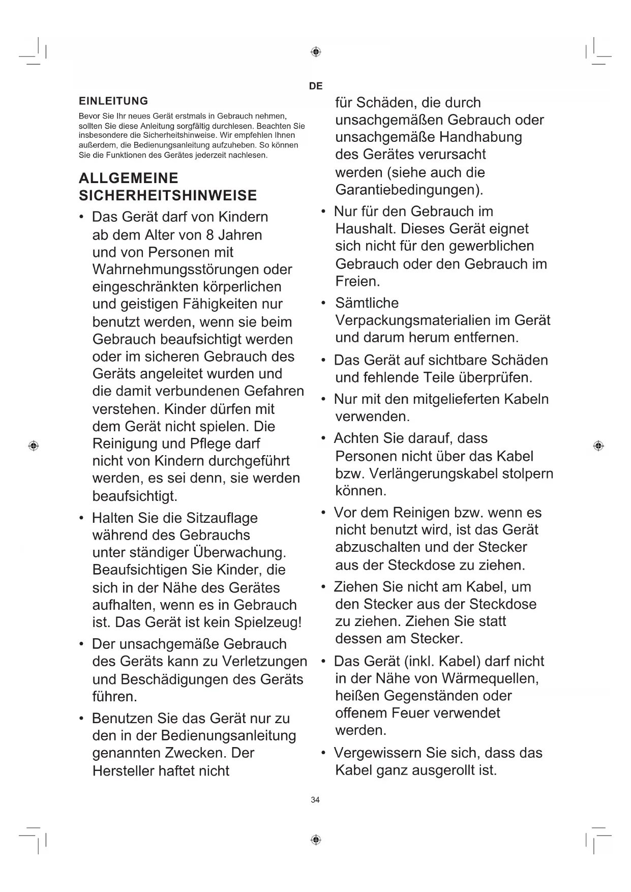 - Sorgen Sie dafür, dass Kinder unter 8 Jahren das Gerät und sein Kabel nicht erreichen können.36