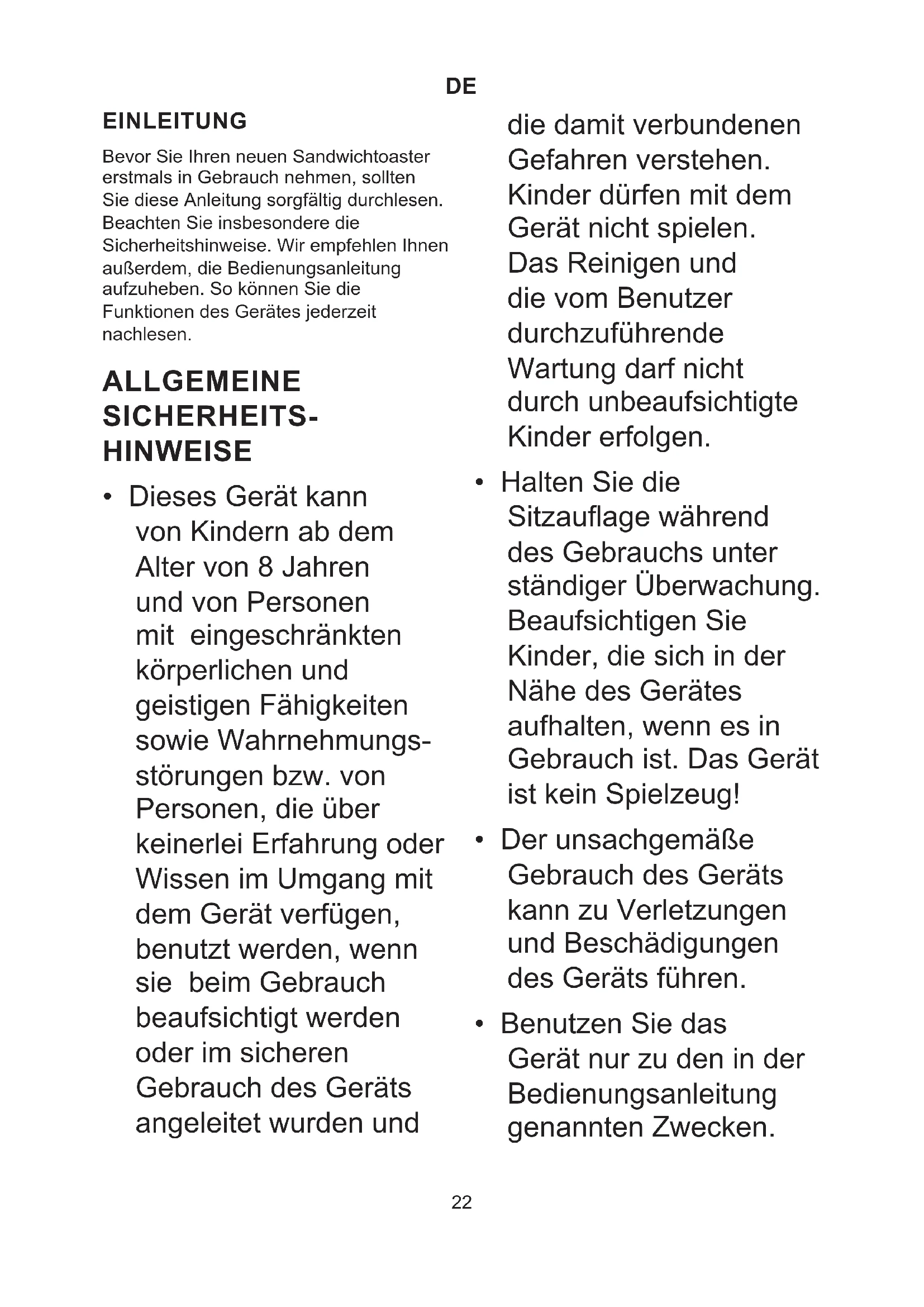 EINLEITUNG Bevor Sie Ihren neuen Sandwichtoaster erstmals in Gebrauch nehmen, sollten Sie diese Anleitung sorgfältig durchlesen. Beachten Sie insbesondere die Sicherheitshinweise. Wir empfehlen Ihnen außerdem, die Bedienungsanleitung aufzuheben. So können Sie die Funktionen des Gerätes jederzeit nachlesen. ALLGEMEINE SICHERHEITS- HINWEISE