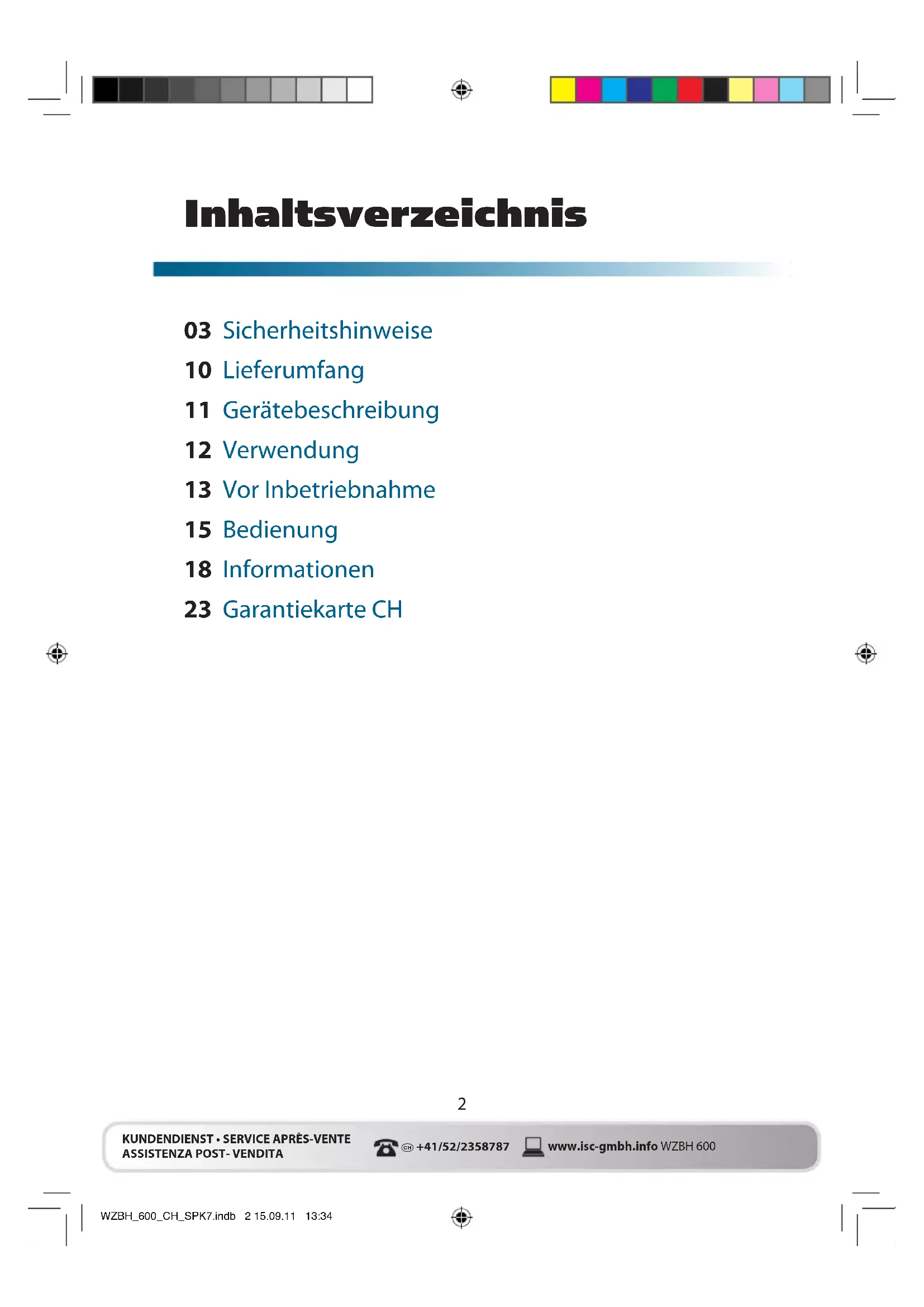 +41/52/2358787 www.isc-gmbh.info WZBH 600 Inhaltsverzeichnis 03 Sicherheitshinweise 10 Lieferumfang 11 Gerätebeschreibung 12 Verwendung 13 Vor Inbetriebnahme 15 Bedienung 18 Informationen 23 Garantiekarte CH WZBH_600_CH_SPK7.indb 2 15.09.11 13:343