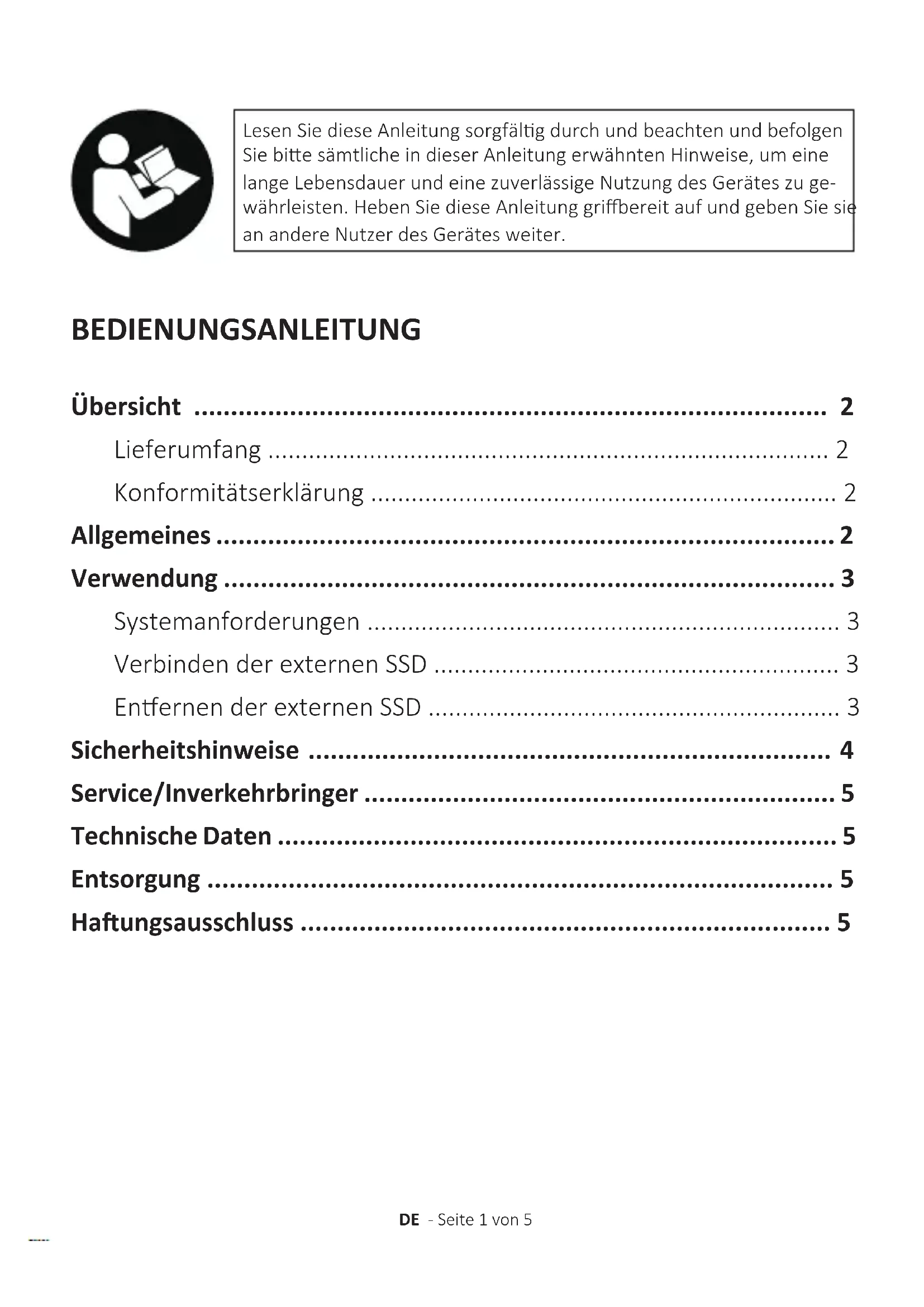 - Haungsausschluss DE - Seite 1 von 5ÜBERSICHT Lieferumfang Bie prüfen Sie, ob der Verpackungsinhalt (siehe auch Grak zu Beginn dieser Anleitung) vollständig und unbeschädigt ist. Sollte dies nicht der Fall sein, wenden Sie sich bie an den Verkäufer oder unseren Service: rma@intenso-internaonal.de Konformitätserklärung Die CE-Kennzeichnung besagt, dass dieses Produkt die Anforderungen aller für dieses Produkt gülgen EU-Richtlinien erfüllt. ALLGEMEINES Zu dieser Anleitung Lesen Sie diese Anleitung sorgfälg durch und beachten und befolgen Sie bie sämtliche in dieser Anleitung erwähnten Hinweise, um eine lange Lebensdauer und eine zuverlässige Nutzung des Gerätes zu gewähr- leisten. Heben Sie diese Anleitung griereit auf und geben Sie sie an andere Nutzer des Gerätes weiter. Besmmungsgemäßer Gebrauch Der Hauptzweck dieser externen SSD besteht in der Speicherung von Daten von PCs, Notebooks, Ultra- books oder MAC-Computern. Dieses Produkt ist nicht für eine kommerzielle Nutzung oder für medizinische und spezielle Anwendungen vorgesehen, in denen der Ausfall des Produktes Verletzungen, Todesfälle oder erhebliche Sachschäden verursachen kann. Im Falle einer Nutzung, die nicht dem besmmungsgemäßen Gebrauch entspricht, erlischt die Haung. Das Önen sowie Umbauen des Gerätes und die Nutzung von Zusatzgeräten und Zubehörteilen, die nicht von uns genehmigt wurden, sind zu unterlassen. Nutzen Sie die externe SSD nicht unter extremen Umgebungsbedingungen und beachten Sie die Sicherheitshinweise. Ein Nichtbeachten der Informaonen und Sicherheitshinweise in dieser Anleitung gilt als nichtbeachten des besmmungsmäßen Gebrauchs und führt zum Erlöschen der Haung und kann zu Personen- oder Sachschäden führen. DE - Seite 2 von 5 Intenso USB 3.2 Gen 2x1 Super Speed 10 Gbps externe SSD (abwärtskompabel) USB 3.2 USB-C Kabel USB-C auf USB-A Kabel Anleitung p. 5