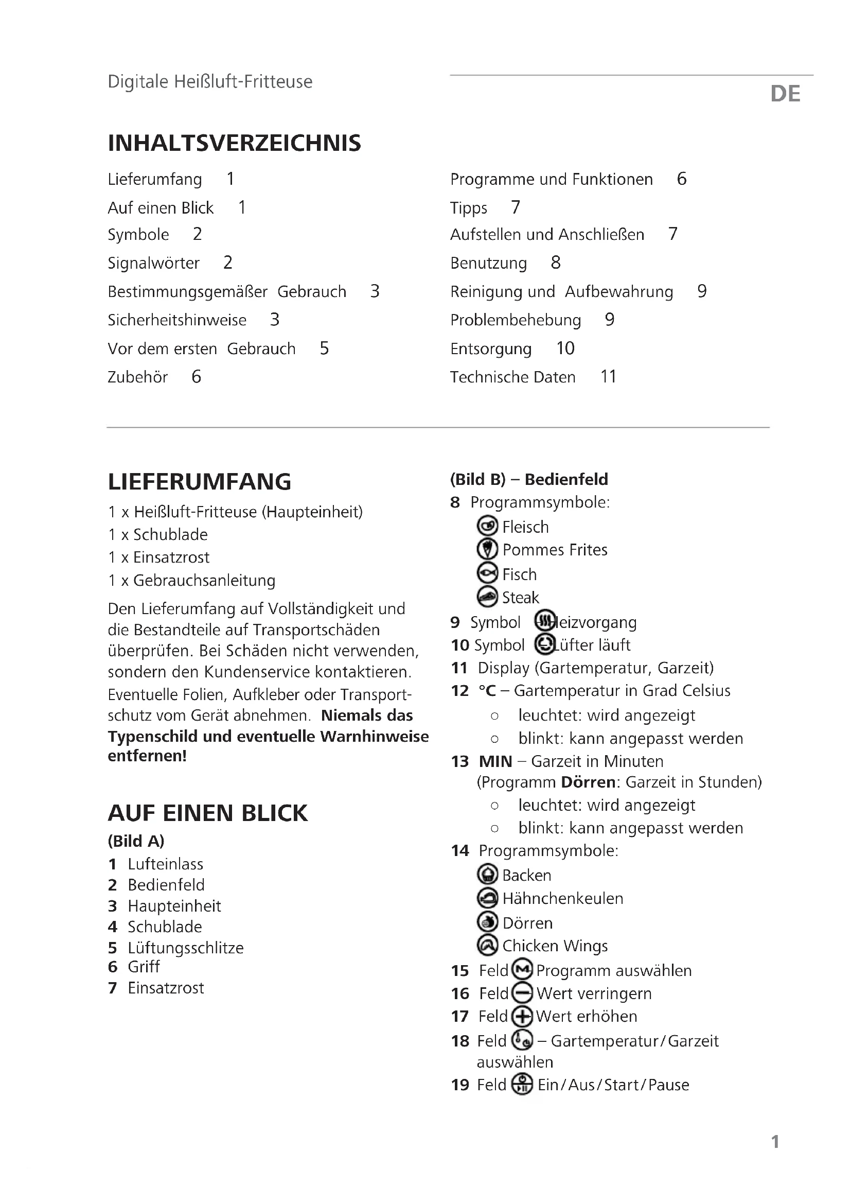 INHALTSVERZEICHNIS Lieferumfang 1 Auf einen Blick 1 Symbole 2 Signalwörter 2 Bestimmungsgemäßer Gebrauch 3 Sicherheitshinweise 3 Vor dem ersten Gebrauch 5 Zubehör 6 Programme und Funktionen 6 Tipps 7 Aufstellen und Anschließen 7 Benutzung 8 Reinigung und Aufbewahrung 9 Problembehebung 9 Entsorgung 10 Technische Daten 11 LIEFERUMFANG 1 x Heißluft-Fritteuse (Haupteinheit) 1 x Schublade 1 x Einsatzrost 1 x Gebrauchsanleitung Den Lieferumfang auf Vollständigkeit und die Bestandteile auf Transportschäden überprüfen. Bei Schäden nicht verwenden, sondern den Kundenservice kontaktieren. Eventuelle Folien, Aufkleber oder Transport- schutz vom Gerät abnehmen. Niemals das Typenschild und eventuelle Warnhinweise entfernen!