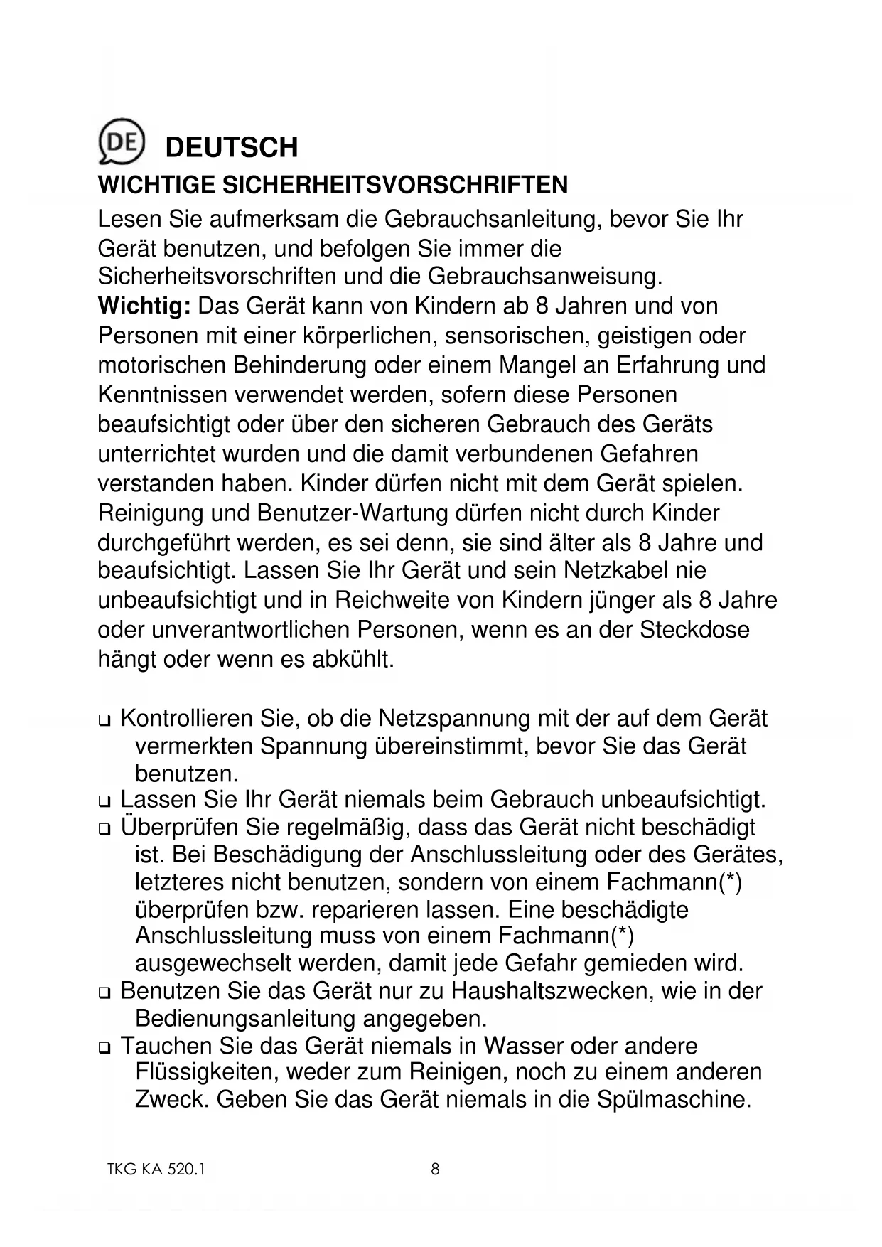 DEUTSCH WICHTIGE SICHERHEITSVORSCHRIFTEN Lesen Sie aufmerksam die Gebrauchsanleitung, bevor Sie Ihr Gerät benutzen, und befolgen Sie immer die Sicherheitsvorschriften und die Gebrauchsanweisung. Wichtig: Das Gerät kann von Kindern ab 8 Jahren und von Personen mit einer körperlichen, sensorischen, geistigen oder motorischen Behinderung oder einem Mangel an Erfahrung und Kenntnissen verwendet werden, sofern diese Personen beaufsichtigt oder über den sicheren Gebrauch des Geräts unterrichtet wurden und die damit verbundenen Gefahren verstanden haben. Kinder dürfen nicht mit dem Gerät spielen. Reinigung und Benutzer-Wartung dürfen nicht durch Kinder durchgeführt werden, es sei denn, sie sind älter als 8 Jahre und beaufsichtigt. Lassen Sie Ihr Gerät und sein Netzkabel nie unbeaufsichtigt und in Reichweite von Kindern jünger als 8 Jahre oder unverantwortlichen Personen, wenn es an der Steckdose hängt oder wenn es abkühlt. ❑ Kontrollieren Sie, ob die Netzspannung mit der auf dem Gerät vermerkten Spannung übereinstimmt, bevor Sie das Gerät benutzen. ❑ Lassen Sie Ihr Gerät niemals beim Gebrauch unbeaufsichtigt. ❑ Überprüfen Sie regelmäßig, dass das Gerät nicht beschädigt ist. Bei Beschädigung der Anschlussleitung oder des Gerätes, letzteres nicht benutzen, sondern von einem Fachmann(*) überprüfen bzw. reparieren lassen. Eine beschädigte Anschlussleitung muss von einem Fachmann(*) ausgewechselt werden, damit jede Gefahr gemieden wird. ❑ Benutzen Sie das Gerät nur zu Haushaltszwecken, wie in der Bedienungsanleitung angegeben. ❑ Tauchen Sie das Gerät niemals in Wasser oder andere Flüssigkeiten, weder zum Reinigen, noch zu einem anderen Zweck. Geben Sie das Gerät niemals in die Spülmaschine.9 TKG KA 520.1