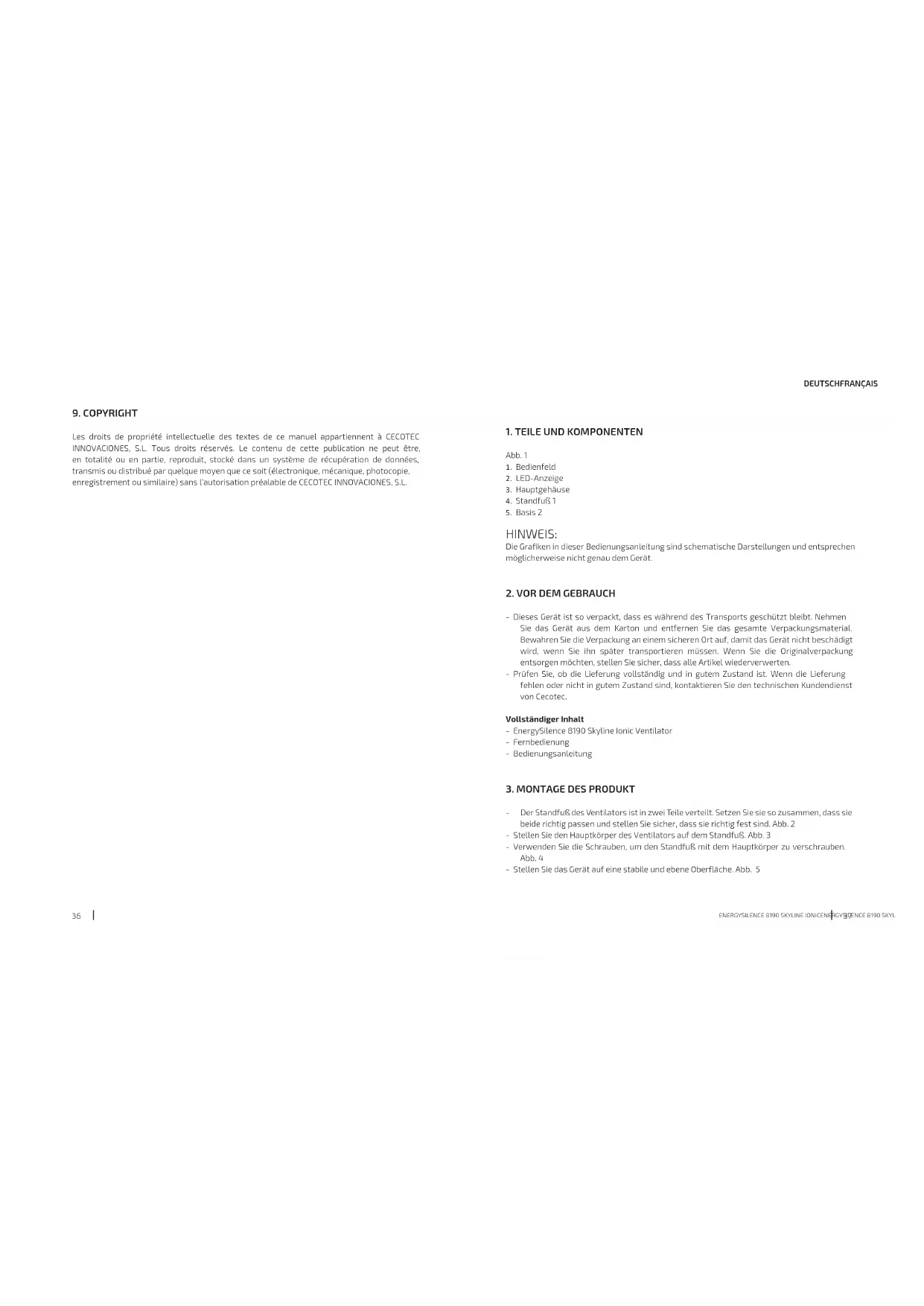 Cecotec haftet gegenüber dem Endnutzer oder Verbraucher für jegliche Konformitätsmängel, die zum Zeitpunkt der Lieferung des Produkts bestehen, gemäß den in den geltenden Vorschriften festgelegten Bedingungen und Fristen. Es wird empfohlen, dass Reparaturen von qualiziertem Personal durchgeführt werden. Sollte unerwartet eine Störung auftreten oder haben Sie Fragen über Ihrem Produkt, können Sie sich mit dem Kundendienst in Verbindung setzen über die Telefonnummer: +34 963210728ENERGYSILENCE 8190 SKYLINE IONICENERGYSILENCE 8190 SKYLINE IONIC