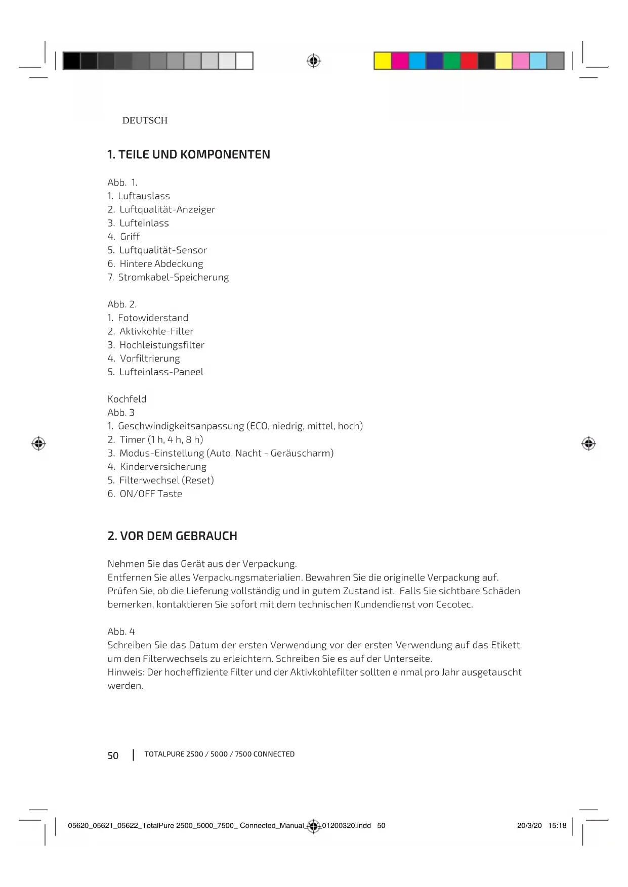 Nehmen Sie das Gerät aus der Verpackung. Entfernen Sie alles Verpackungsmaterialien. Bewahren Sie die originelle Verpackung auf. Prüfen Sie, ob die Lieferung vollständig und in gutem Zustand ist. Falls Sie sichtbare Schäden bemerken, kontaktieren Sie sofort mit dem technischen Kundendienst von Cecotec. Abb. 4 Schreiben Sie das Datum der ersten Verwendung vor der ersten Verwendung auf das Etikett, um den Filterwechsels zu erleichtern. Schreiben Sie es auf der Unterseite. Hinweis: Der hocheffiziente Filter und der Aktivkohlefilter sollten einmal pro Jahr ausgetauscht werden. 05620_05621_05622_TotalPure 2500_5000_7500_ Connected_Manual_YV_01200320.indd 5005620_05621_05622_TotalPure 2500_5000_7500_ Connected_Manual_YV_01200320.indd 50 20/3/20 15:1820/3/20 15:18TOTALPURE 2500 / 5000 / 7500 CONNECTED
