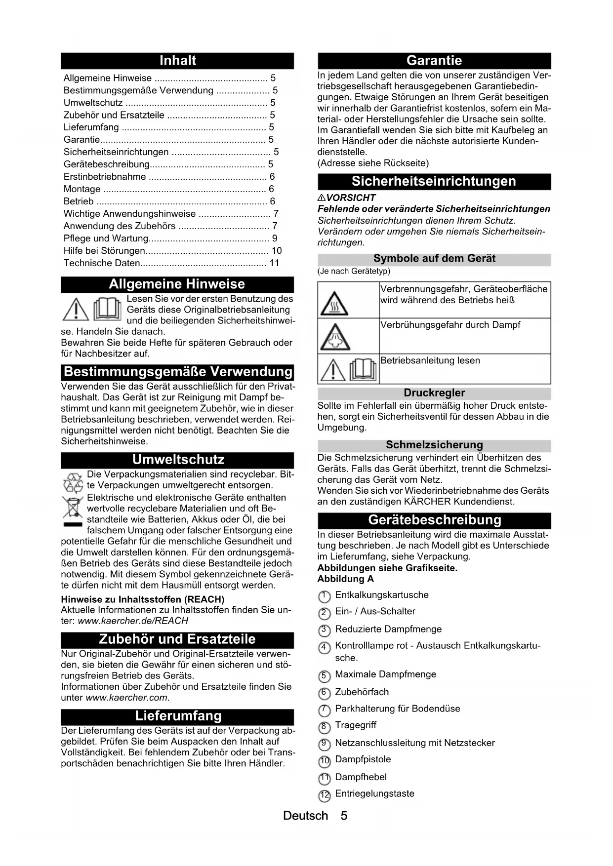182AB C D E F G H I J K L MN O P Q R SDeutsch 5 Inhalt Allgemeine Hinweise Lesen Sie vor der ersten Benutzung des Geräts diese Originalbetriebsanleitung und die beiliegenden Sicherheitshinwei- se. Handeln Sie danach. Bewahren Sie beide Hefte für späteren Gebrauch oder für Nachbesitzer auf. Bestimmungsgemäße Verwendung Verwenden Sie das Gerät ausschließlich für den Privat- haushalt. Das Gerät ist zur Reinigung mit Dampf be- stimmt und kann mit geeignetem Zubehör, wie in dieser Betriebsanleitung beschrieben, verwendet werden. Rei- nigungsmittel werden nicht benötigt. Beachten Sie die Sicherheitshinweise. Umweltschutz Die Verpackungsmaterialien sind recyclebar. Bit- te Verpackungen umweltgerecht entsorgen. Elektrische und elektronische Geräte enthalten wertvolle recyclebare Materialien und oft Be- standteile wie Batterien, Akkus oder Öl, die bei falschem Umgang oder falscher Entsorgung eine potentielle Gefahr für die menschliche Gesundheit und die Umwelt darstellen können. Für den ordnungsgemä- ßen Betrieb des Geräts sind diese Bestandteile jedoch notwendig. Mit diesem Symbol gekennzeichnete Gerä- te dürfen nicht mit dem Hausmüll entsorgt werden. Hinweise zu Inhaltsstoffen (REACH) Aktuelle Informationen zu Inhaltsstoffen finden Sie un- ter: www.kaercher.de/REACH Zubehör und Ersatzteile Nur Original-Zubehör und Original-Ersatzteile verwen- den, sie bieten die Gewähr für einen sicheren und stö- rungsfreien Betrieb des Geräts. Informationen über Zubehör und Ersatzteile finden Sie unter www.kaercher.com. Lieferumfang Der Lieferumfang des Geräts ist auf der Verpackung ab- gebildet. Prüfen Sie beim Auspacken den Inhalt auf Vollständigkeit. Bei fehlendem Zubehör oder bei Trans- portschäden benachrichtigen Sie bitte Ihren Händler. Garantie In jedem Land gelten die von unserer zuständigen Ver- triebsgesellschaft herausgegebenen Garantiebedin- gungen. Etwaige Störungen an Ihrem Gerät beseitigen wir innerhalb der Garantiefrist kostenlos, sofern ein Ma- terial- oder Herstellungsfehler die Ursache sein sollte. Im Garantiefall wenden Sie sich bitte mit Kaufbeleg an Ihren Händler oder die nächste autorisierte Kunden- dienststelle. (Adresse siehe Rückseite) Sicherheitseinrichtungen 몇 VORSICHT Fehlende oder veränderte Sicherheitseinrichtungen Sicherheitseinrichtungen dienen Ihrem Schutz. Verändern oder umgehen Sie niemals Sicherheitsein- richtungen. Symbole auf dem Gerät (Je nach Gerätetyp) Druckregler Sollte im Fehlerfall ein übermäßig hoher Druck entste- hen, sorgt ein Sicherheitsventil für dessen Abbau in die Umgebung. Schmelzsicherung Die Schmelzsicherung verhindert ein Überhitzen des Geräts. Falls das Gerät überhitzt, trennt die Schmelzsi- cherung das Gerät vom Netz. Wenden Sie sich vor Wiederinbetriebnahme des Geräts an den zuständigen KÄRCHER Kundendienst. Gerätebeschreibung In dieser Betriebsanleitung wird die maximale Ausstat- tung beschrieben. Je nach Modell gibt es Unterschiede im Lieferumfang, siehe Verpackung. Abbildungen siehe Grafikseite. Abbildung A