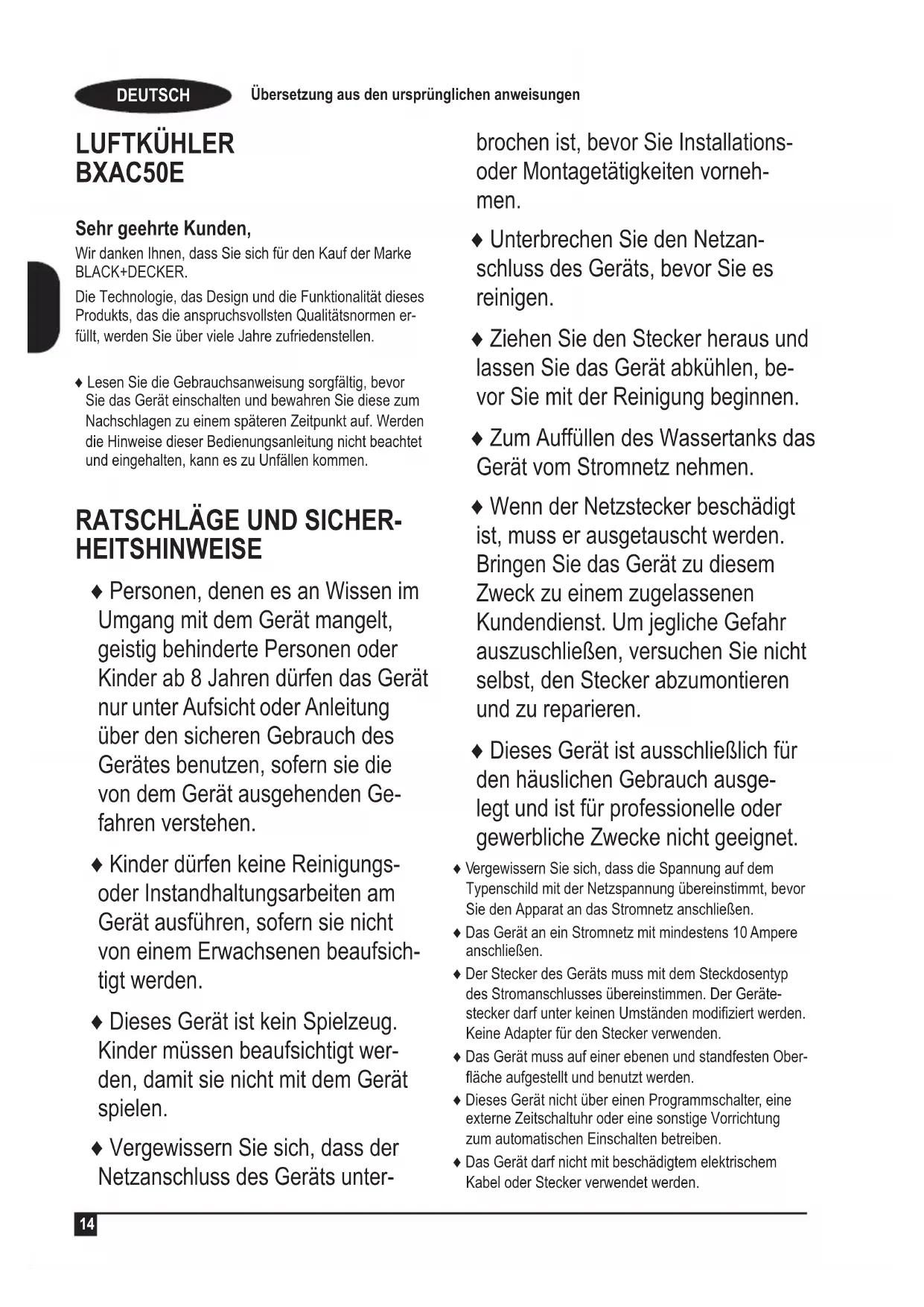LUFTKÜHLER BXAC50E Sehr geehrte Kunden, Wir danken Ihnen, dass Sie sich für den Kauf der Marke BLACK+DECKER. Die Technologie, das Design und die Funktionalität dieses Produkts, das die anspruchsvollsten Qualitätsnormen er- füllt, werden Sie über viele Jahre zufriedenstellen. ♦ Lesen Sie die Gebrauchsanweisung sorgfältig, bevor Sie das Gerät einschalten und bewahren Sie diese zum Nachschlagen zu einem späteren Zeitpunkt auf. Werden die Hinweise dieser Bedienungsanleitung nicht beachtet und eingehalten, kann es zu Unfällen kommen.