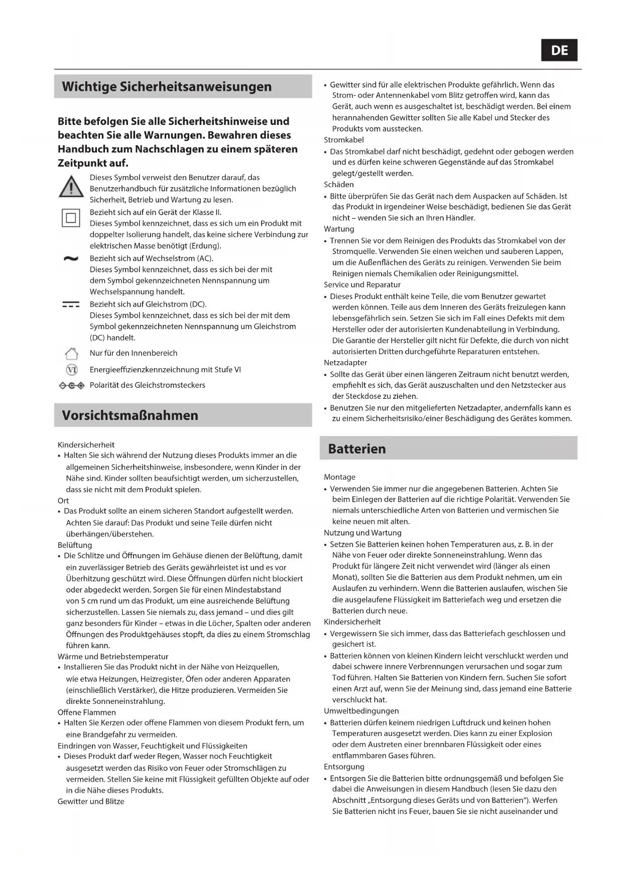 Dieses Symbol verweist den Benutzer darauf, das Benutzerhandbuch für zusätzliche Informationen bezüglich Sicherheit, Betrieb und Wartung zu lesen. Bezieht sich auf ein Gerät der KlasseII. Dieses Symbol kennzeichnet, dass es sich um ein Produkt mit doppelter Isolierung handelt, das keine sichere Verbindung zur elektrischen Masse benötigt (Erdung). Bezieht sich auf Wechselstrom (AC). Dieses Symbol kennzeichnet, dass es sich bei der mit dem Symbol gekennzeichneten Nennspannung um Wechselspannung handelt. Bezieht sich auf Gleichstrom (DC). Dieses Symbol kennzeichnet, dass es sich bei der mit dem Symbol gekennzeichneten Nennspannung um Gleichstrom (DC) handelt. Nur für den Innenbereich Energieezienzkennzeichnung mit StufeVI Polarität des Gleichstromsteckers Vorsichtsmaßnahmen Kindersicherheit