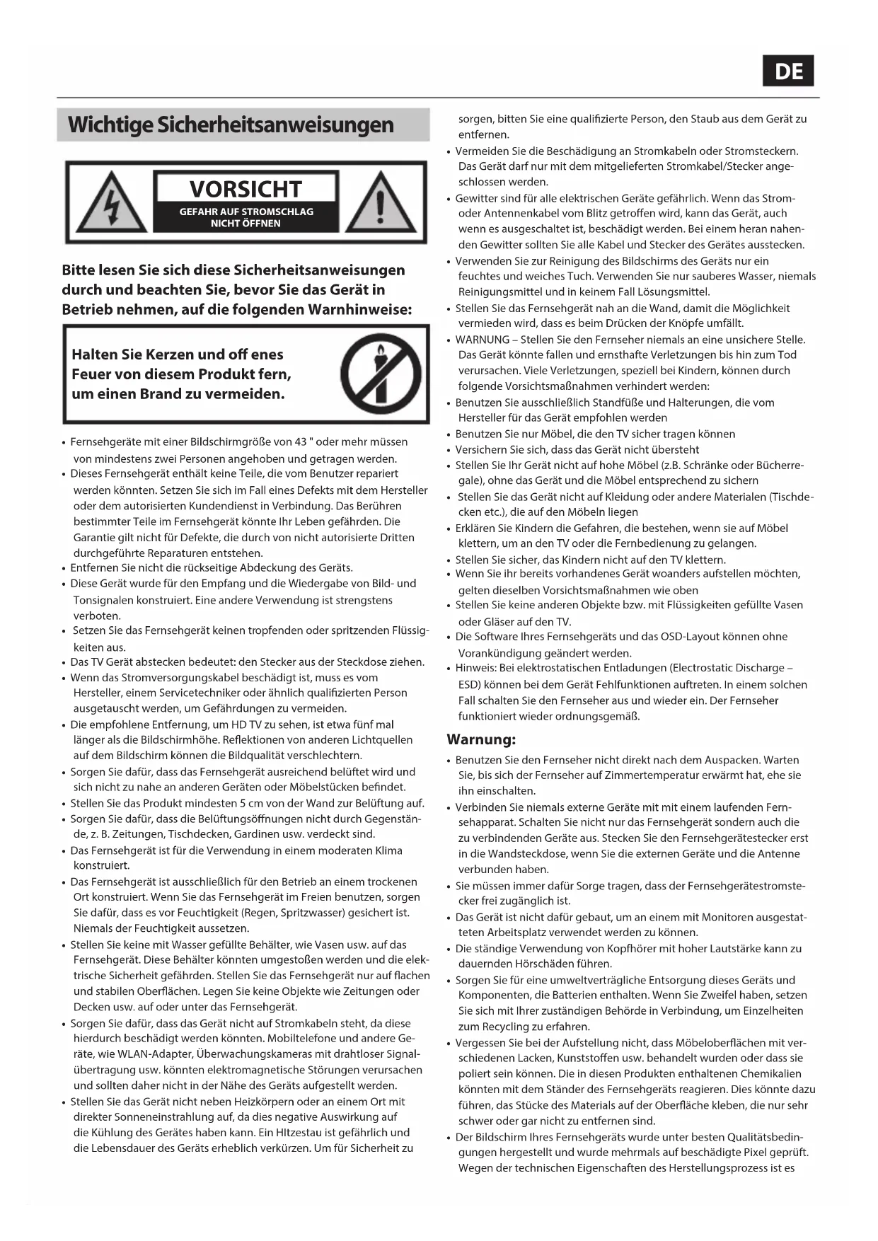 - Hinweis: Bei elektrostatischen Entladungen (Electrostatic Discharge – ESD) können bei dem Gerät Fehlfunktionen auftreten. In einem solchen Fall schalten Sie den Fernseher aus und wieder ein. Der Fernseher funktioniert wieder ordnungsgemäß. Warnung: