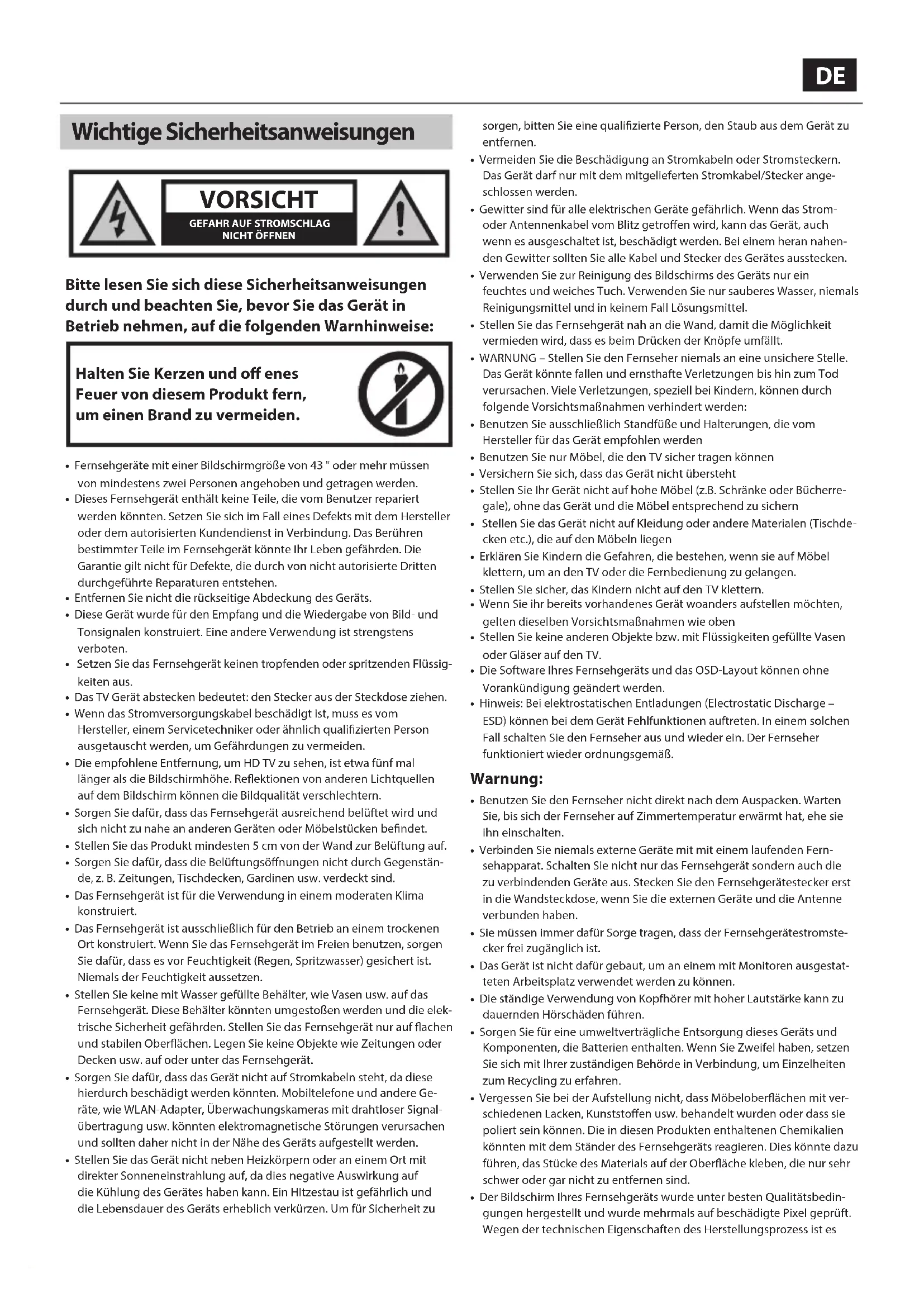 - Dieses Fernsehgerät enthält keine Teile, die vom Benutzer repariert werden könnten. Setzen Sie sich im Fall eines Defekts mit dem Hersteller oder dem autorisierten Kundendienst in Verbindung. Das Berühren bestimmter Teile im Fernsehgerät könnte Ihr Leben gefährden. Die Garantie gilt nicht für Defekte, die durch von nicht autorisierte Dritten durchgeführte Reparaturen entstehen.