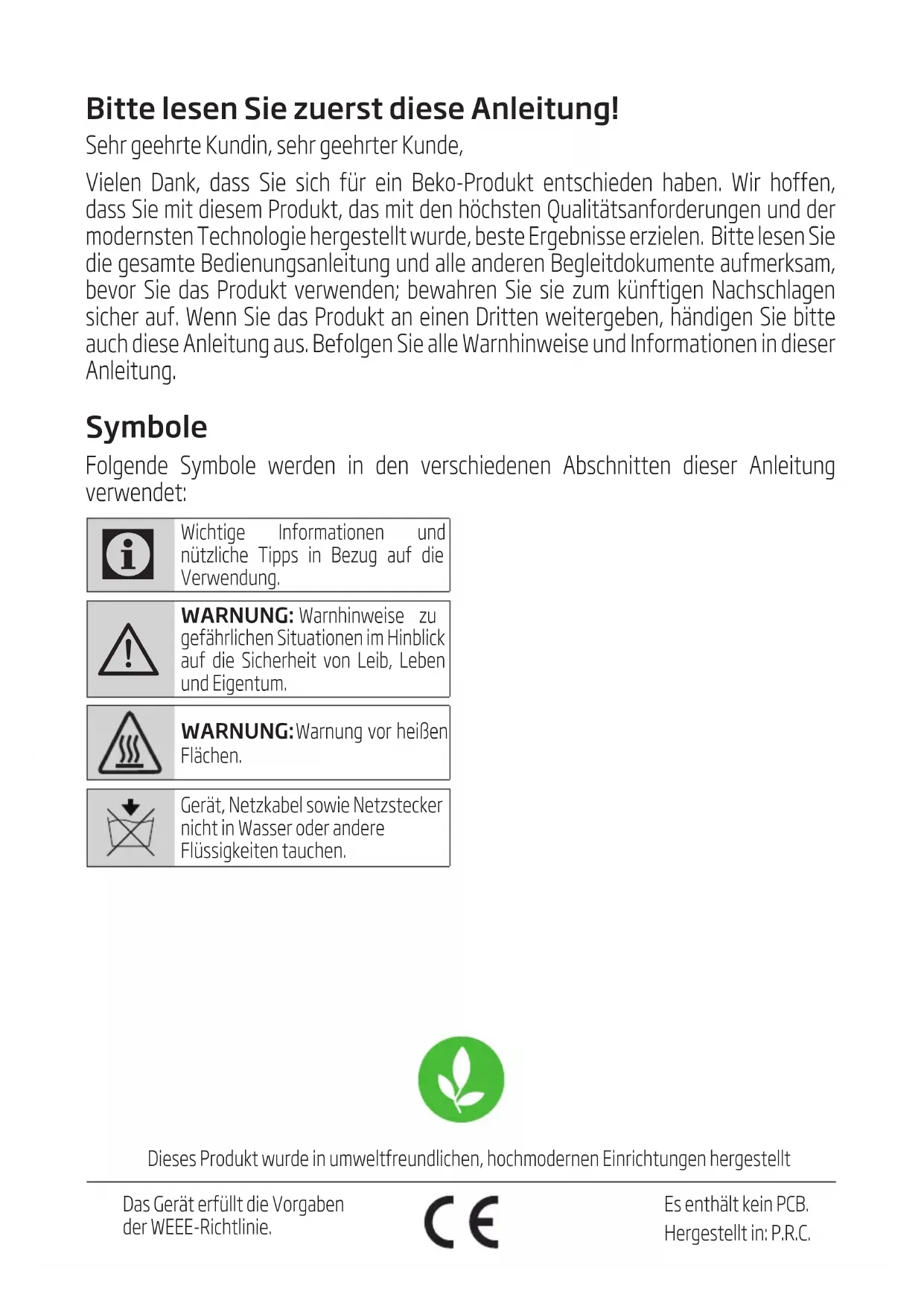 - During handling and transportation, carry the appliance in its original packaging. The packaging of the appliance protects it against physical damages. • Do not place heavy loads on the appliance or the packaging. The appliance may be damaged. • Dropping the appliance will render it non-operational or cause permanent damage.Bitte lesen Sie zuerst diese Anleitung! Sehr geehrte Kundn, sehr geehrter Kunde, Velen Dank, dass Se sch für en Beko-Produkt entscheden haben. Wr hoffen, dass Se mt desem Produkt, das mt den höchsten Qualtätsanforderungen und der modernsten Technologe hergestellt wurde, beste Ergebnsse erzelen. Btte lesen Se de gesamte Bedenungsanletung und alle anderen Begletdokumente aufmerksam, bevor Se das Produkt verwenden; bewahren Se se zum künftgen Nachschlagen scher auf. Wenn Se das Produkt an enen Drtten wetergeben, händgen Se btte auch dese Anletung aus. Befolgen Se alle Warnhnwese und Informatonen n deser Anletung. Symbole Folgende Symbole werden n den verschedenen Abschntten deser Anletung verwendet:
