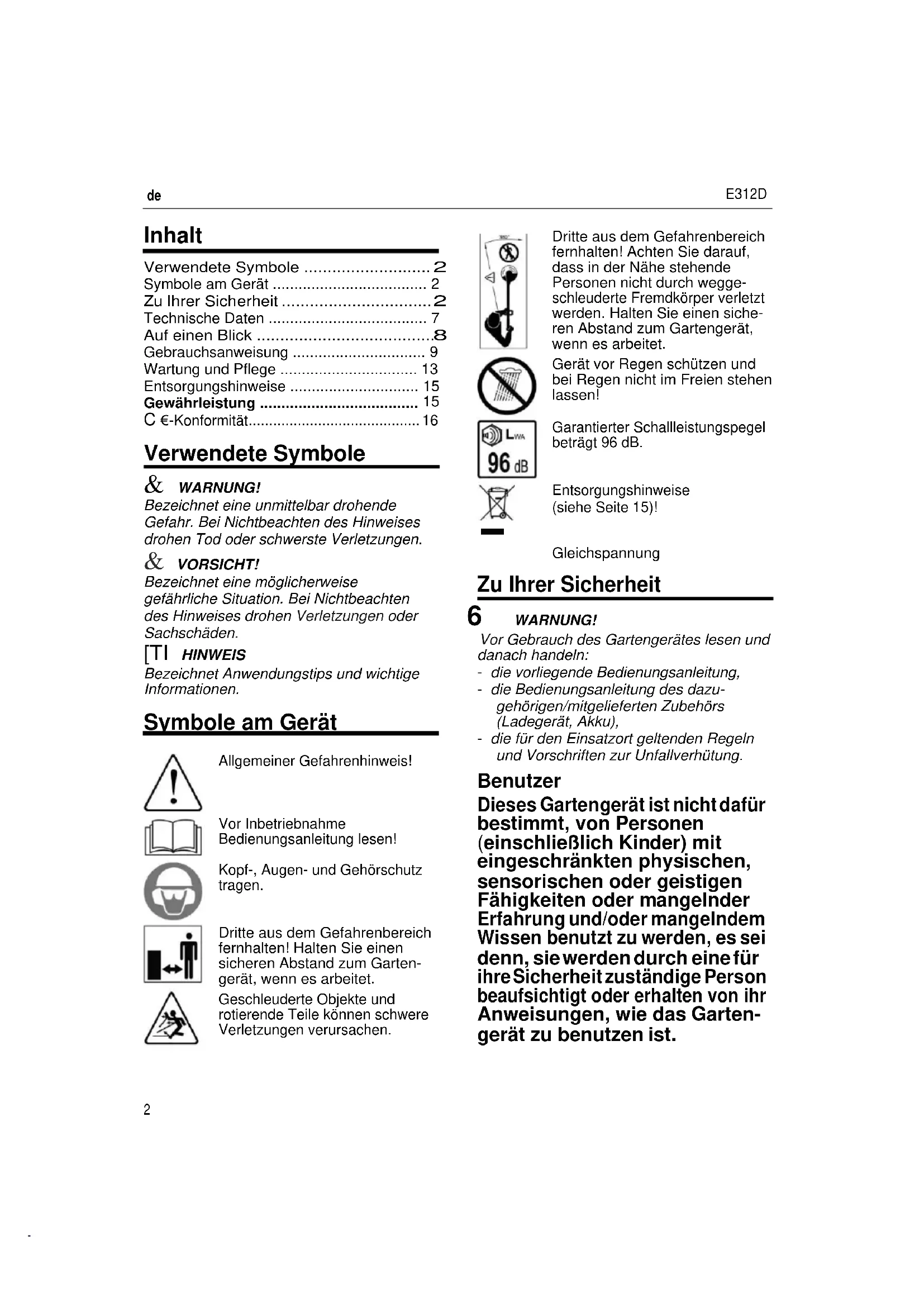 Düngemittel und andere Gartenchemi- kalien enthalten Stoffe, die stark korrosiv auf die Metallteile wirken können. Lagern Sie das Gerät nicht in der Nähe dieser Stoffe. Reparaturen Gerät auf Schäden prüfen. Reparaturen ausschließlich durch eine vom Hersteller autorisierte Kundendienstwerkstatt ausführen lassen.E312D