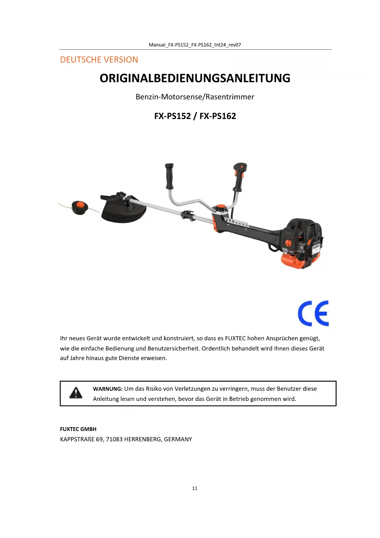 Diese Maschine darf nur zum Mähen bzw. Trimmen von Gras, Unkraut und Gestrüpp verwendet werden. Nie für andere Zwecke verwenden, da es dabei zu schweren Verletzungen kommen kann! Korrekte Sicherheitsanweisungen müssen beachtet werden. SETZEN SIE SICH ODER ANDERE NICHT GEFAHR AUS. Befolgen Sie diese allgemeine Sicherheitshinweise: ● Immer Sicherheitsschutzbrille für Augenschutz tragen. Langes Haar muss zurück gebunden werden. Tragen Sie keine lose Kleidung oder Schmucksachen, die sich in beweglichen Teilen der Maschine verfangen werden können. Sichere, starke, rutschfeste Sicherheitsschuhe müssen immer getragen werden. Es wird empfohlen, dass Beine und Füße umfassend geschützt werden, um sich vor fliegenden Gegenständen während des Betriebes zu schützen. ● Prüfen Sie die gesamte Maschine auf lose Teile (Schraubenmuttern, Bolzen, Schrauben, usw.). Warten oder ersetzen Sie diese falls erforderlich, bevor Sie die Maschine verwenden. Benutzen Sie kein Zubehör mit diesem Antriebskopf, als die vom Hersteller empfohlenen. Sonst können ernste Verletzungen des Benutzers oder der umstehenden Personen sowie Beschädigungen der Maschine daraus resultieren. ● Halten Sie die Handgriffe frei von Öl und Kraftstoff. ● Benutzen Sie immer beim Schnitt korrekte Handgriffe und den Schultergurt ● Rauchen Sie nicht beim Mischen des Kraftstoffs oder beim Füllen des Tanks ● Mischen Sie nicht Kraftstoff in einem geschlossenen Raum oder in der Nähe von offenen Feuern. Achten Sie auf ausreichende Belüftung / Ventilation ● Mischen und lagern Sie das Kraftstoffgemisch in einem gekennzeichneten Behälter, der nach lokalen Vorschriften für einen solchen Gebrauch zugelassen ist. ● Entfernen Sie nie die Kraftstofftankkappe, während die Maschine läuft ● Betreiben Sie die Maschine nicht in geschlossenen Räumen oder Gebäuden. Abgase enthalten gefährliches Kohlenmonoxid. ● Versuchen Sie nicht beim Laufen und beim Tragen die Maschine einzustellen. Stellen Sie immer die Maschine auf einer ebenen, freien Oberfläche ein. ● Benutzen Sie nicht die Maschine, wenn diese beschädigt ist. Entfernen Sie nie Schutzeinrichtungen der Maschine. Sonst kann es zu ernsten Verletzungen des Bedieners oder der Zuschauer kommen, sowie Beschädigung der Maschine daraus resultieren. ● Kontrollieren Sie den Bereich, der zu Schneiden ist, und entfernen Sie alle Rückstande, die im Nylonschnittkopf oder im Schneidblatt verwickelt werden können. Entfernen Sie auch alle möglichen Gegenstände, die die Maschine beim Schnitt herumschleudern könnte. ● Lassen Sie nie die Maschine unbeaufsichtigt. ● Strecken Sie sich nicht weit vorne über. Behalten Sie ständig sicheren Stand und Balance. Lassen Sie nicht die Maschine beim Stehen auf einer Leiter oder auf irgendeiner anderen instabilen Stehposition laufen.Manual_FX-PS152_FX-PS162_Int24_rev07