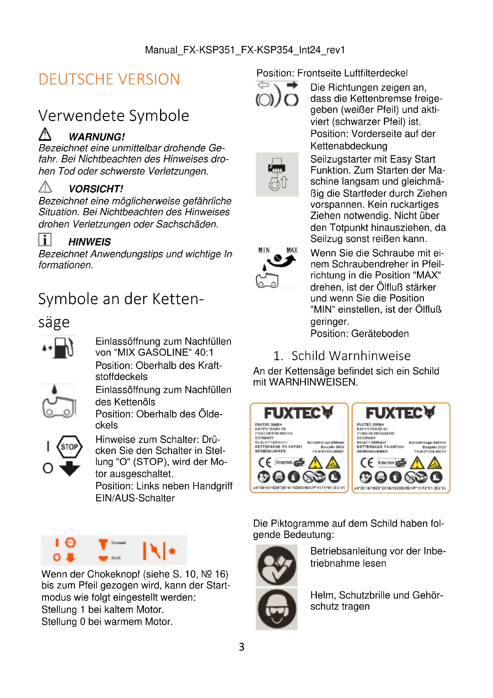 WARNUNG! Unbedachter Umgang mit der Kettensäge kann schwerste Verletzungen bis hin zum Tode zur Folge haben.Manual_FX-KSP351_FX-KSP354_Int24_rev1