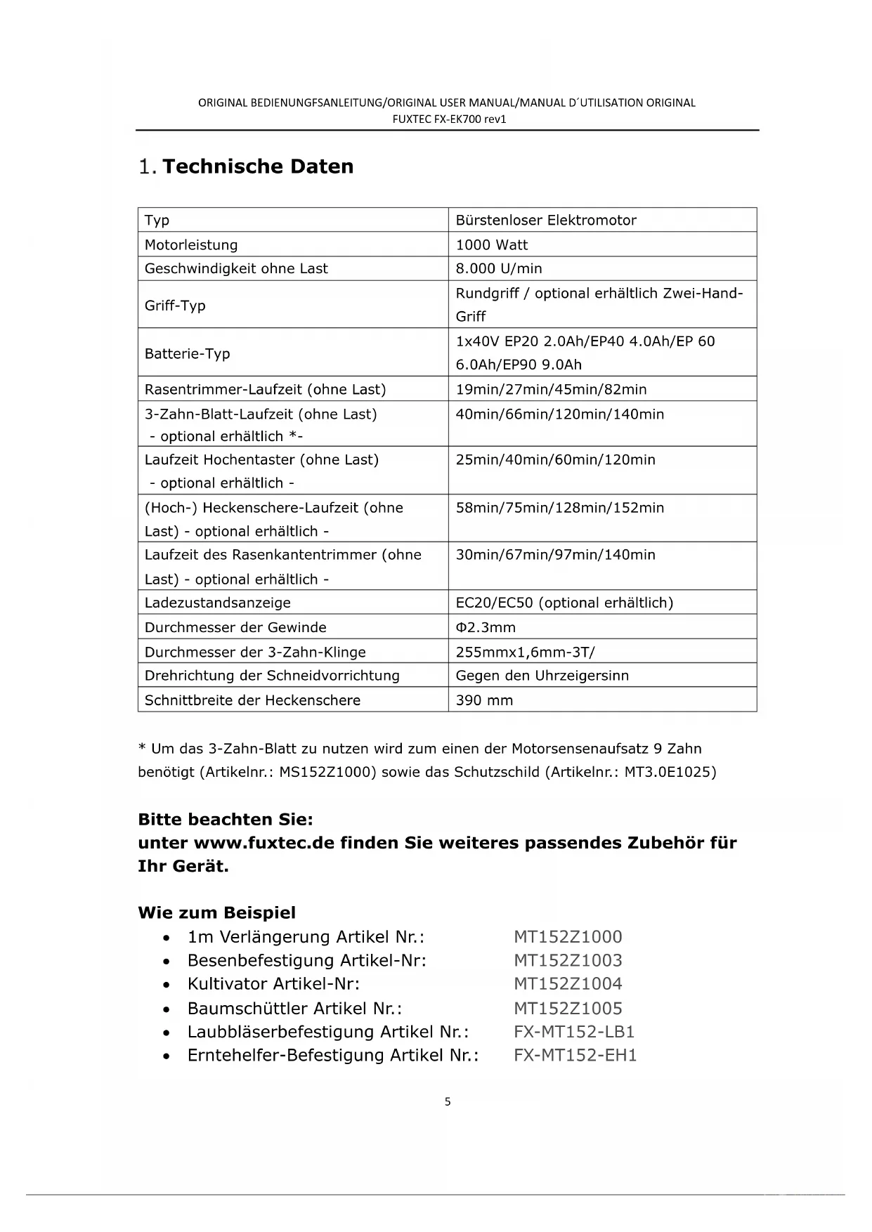 Ihr neues Gerät wurde so entwickelt und konstruiert, dass es die hohen Standards von FUXTEC, wie einfache Bedienung und Anwendersicherheit, erfüllt. Richtig behandelt, wird Ihnen dieses Gerät über Jahre hinweg gute Dienste leisten. WARNUNG: Um das Verletzungsrisiko zu verringern, muss der Benutzer dieses Handbuch vor der Inbetriebnahme des Gerätes lesen und verstehen. FUXTEC GmbH KAPPSTRAßE 69, 71083 HERRENBERG-GÜLTSTEIN, DEUTSCHLANDORIGINAL BEDIENUNGFSANLEITUNG/ORIGINAL USER MANUAL/MANUAL D´UTILISATION ORIGINAL FUXTEC FX-EK700 rev1
