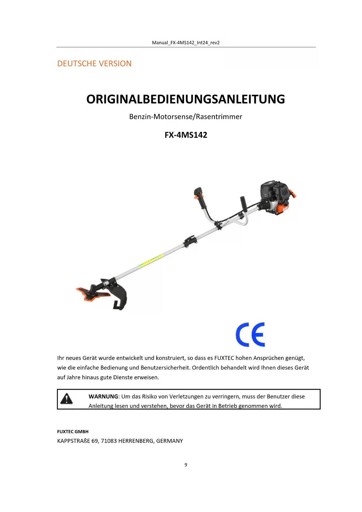 Diese Maschine darf nur zum Mähen bzw. Trimmer von Gras, Unkraut und Gestrüpp verwendet werden. Nie für andere Zwecke verwenden, da es dabei zu Verletzungen kommen kann!Manual_FX-4MS142_Int24_rev2