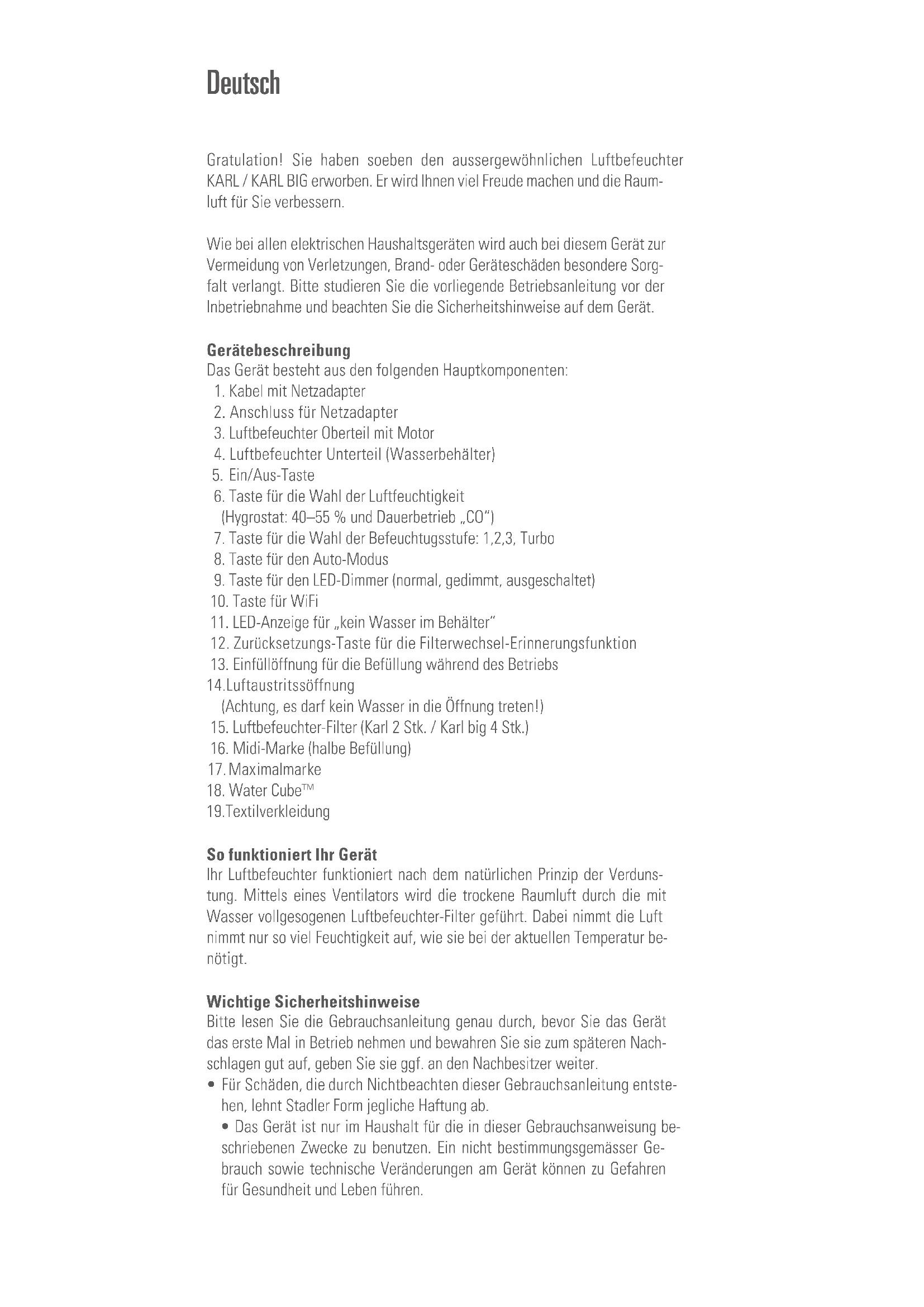 Dimensions 502 x 335 x 242 mm (width x height x depth) Weight 4.6 kg Tank capacity 11.0 liter Sound level 27 – 60 dB(A) Complies with EU regulations CE / WEEE / RoHS / EAC / UKCA This device contains a radio module from Stadler Form Aktiengesellschaft type: WBR3. It operates in the ISM band in the range 2.400 – 2.4835 GHz with a maximum transmitted power 20 dBm. All rights for any technical modifications are reservedGratulation! Sie haben soeben den aussergewöhnlichen Luftbefeuchter KARL / KARL BIG erworben. Er wird Ihnen viel Freude machen und die Raum- luft für Sie verbessern. Wie bei allen elektrischen Haushaltsgeräten wird auch bei diesem Gerät zur Vermeidung von Verletzungen, Brand- oder Geräteschäden besondere Sorg- falt verlangt. Bitte studieren Sie die vorliegende Betriebsanleitung vor der Inbetriebnahme und beachten Sie die Sicherheitshinweise auf dem Gerät. Gerätebeschreibung Das Gerät besteht aus den folgenden Hauptkomponenten: