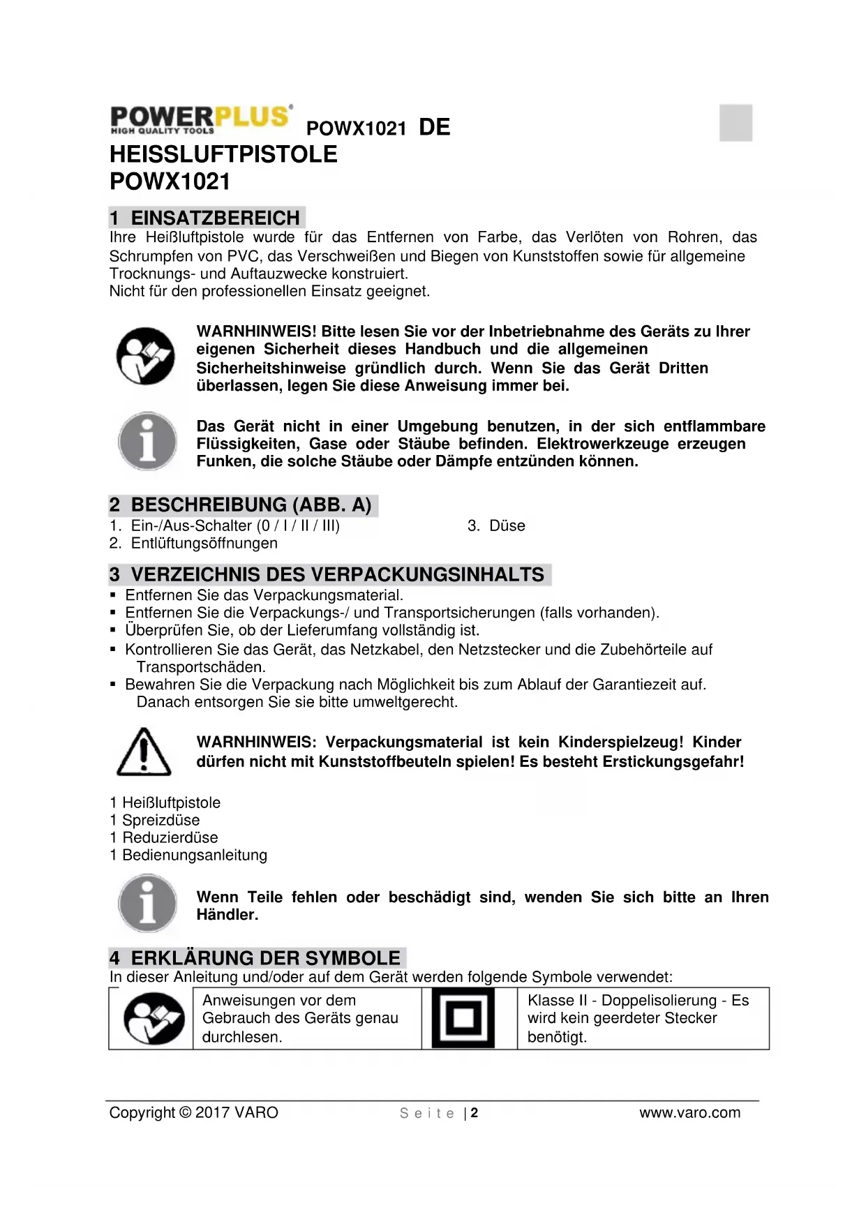 Klasse II - Doppelisolierung - Es wird kein geerdeter Stecker benötigt.POWX1021 DE Copyright © 2017 VARO S e i t e | 3 www.varo.com