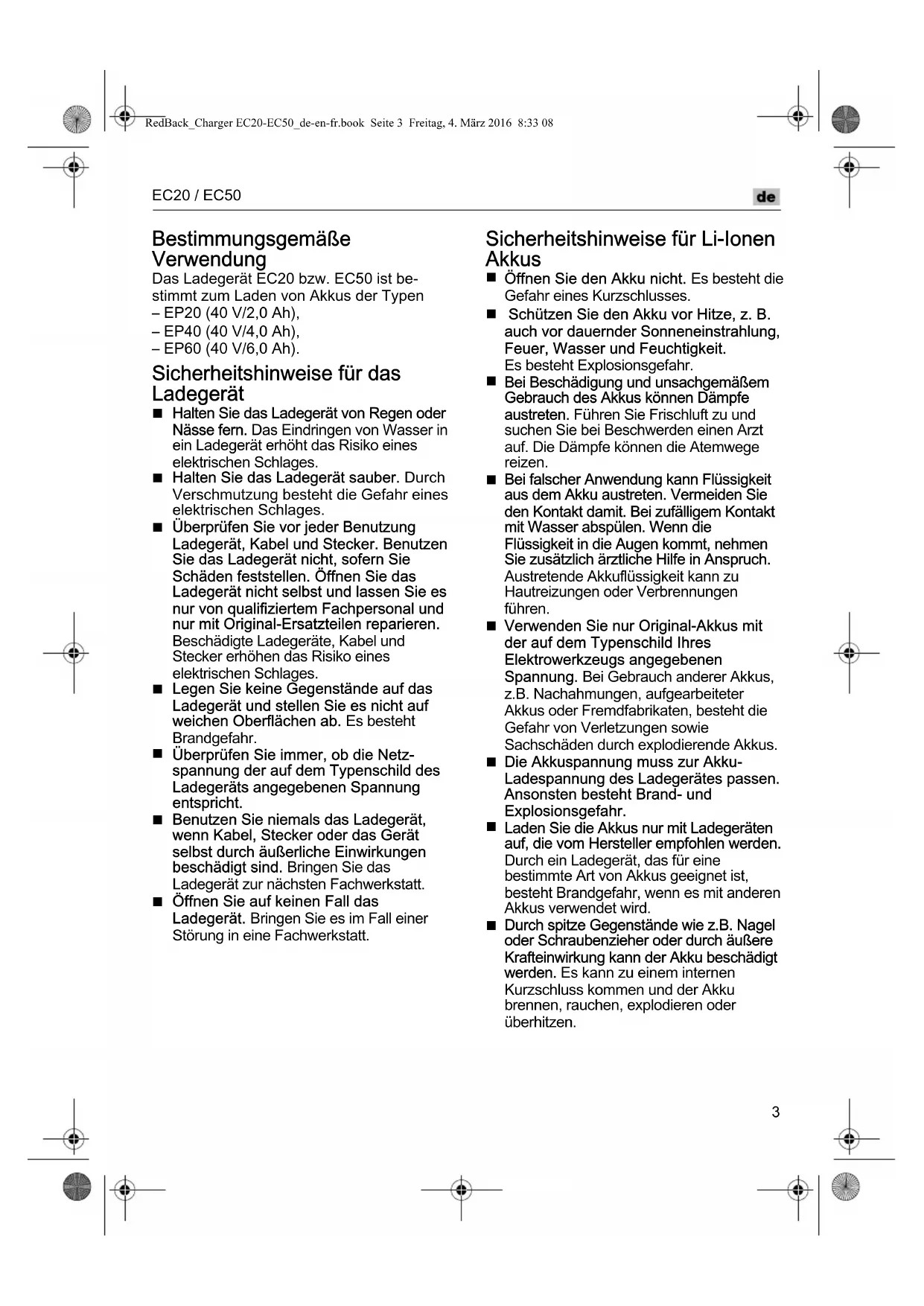 Betriebstemperatur °C 0-40 Gewicht (ohne Akku) kg 0,9 1,2 Schutzklasse II / RedBack_Charger EC20-EC50_de-en-fr.book Seite 4 Freitag, 4. März 2016 8:33 08EC20 / EC50