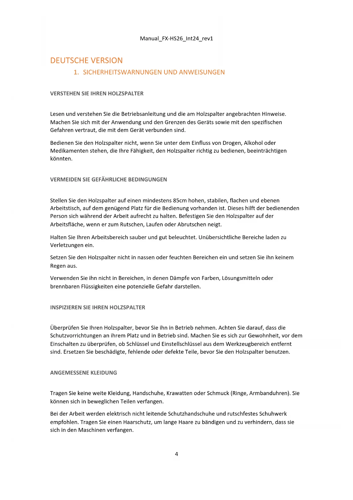 Überprüfen Sie Ihren Holzspalter, bevor Sie ihn in Betrieb nehmen. Achten Sie darauf, dass die Schutzvorrichtungen an ihrem Platz und in Betrieb sind. Machen Sie es sich zur Gewohnheit, vor dem Einschalten zu überprüfen, ob Schlüssel und Einstellschlüssel aus dem Werkzeugbereich entfernt sind. Ersetzen Sie beschädigte, fehlende oder defekte Teile, bevor Sie den Holzspalter benutzen. ANGEMESSENE KLEIDUNG Tragen Sie keine weite Kleidung, Handschuhe, Krawatten oder Schmuck (Ringe, Armbanduhren). Sie können sich in beweglichen Teilen verfangen. Bei der Arbeit werden elektrisch nicht leitende Schutzhandschuhe und rutschfestes Schuhwerk empfohlen. Tragen Sie einen Haarschutz, um lange Haare zu bändigen und zu verhindern, dass sie sich in den Maschinen verfangen.Manual_FX-HS26_Int24_rev1