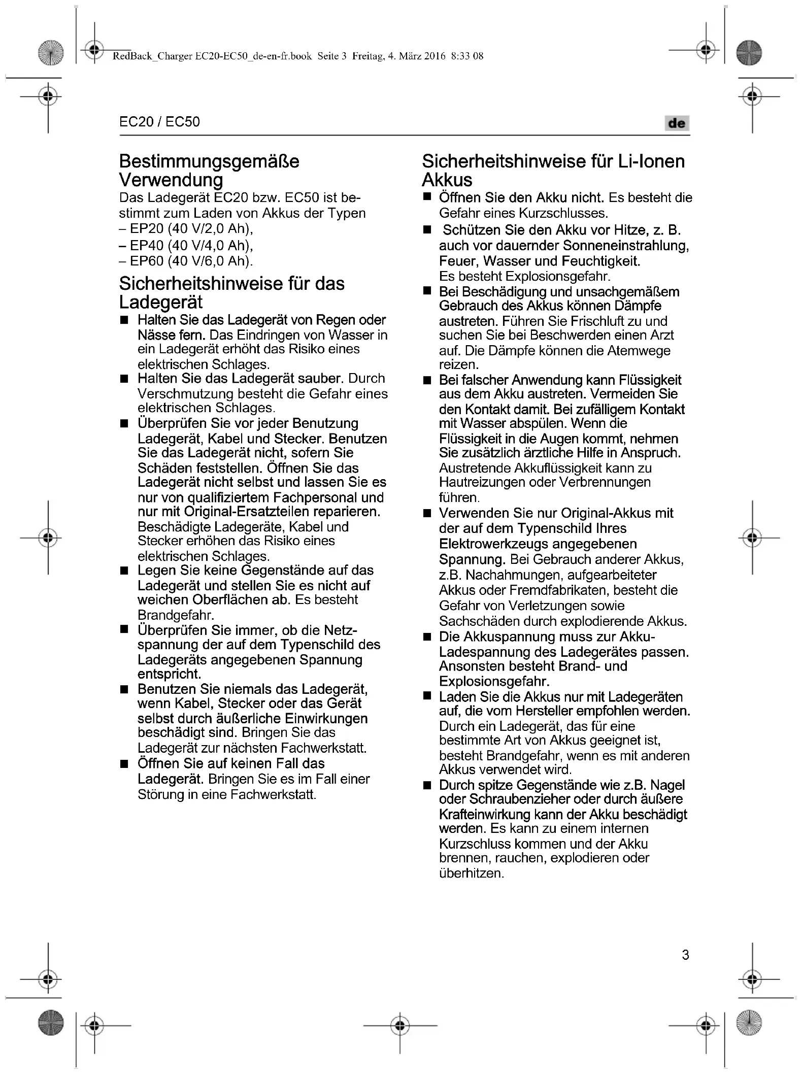 Durch spitze Gegenstände wie z.B. Nagel oder Schraubenzieher oder durch äußere Krafteinwirkung kann der Akku beschädigt werden. Es kann zu einem internen Kurzschluss kommen und der Akku brennen, rauchen, explodieren oder überhitzen. RedBack_Charger EC20-EC50_de-en-fr.book Seite 3 Freitag, 4. März 2016 8:33 08EC20 / EC50