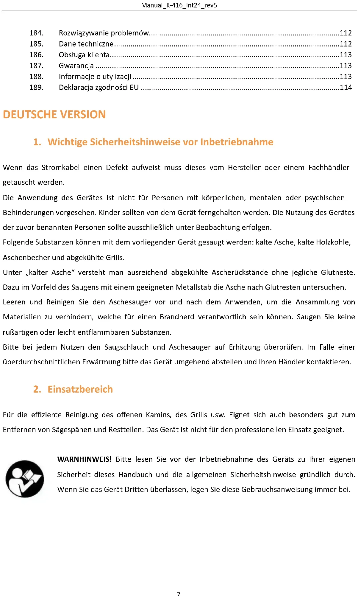 Für die effiziente Reinigung des offenen Kamins, des Grills usw. Eignet sich auch besonders gut zum Entfernen von Sägespänen und Restteilen. Das Gerät ist nicht für den professionellen Einsatz geeignet. WARNHINWEIS! Bitte lesen Sie vor der Inbetriebnahme des Geräts zu Ihrer eigenen Sicherheit dieses Handbuch und die allgemeinen Sicherheitshinweise gründlich durch. Wenn Sie das Gerät Dritten überlassen, legen Sie diese Gebrauchsanweisung immer bei.Manual_K-416_Int24_rev5