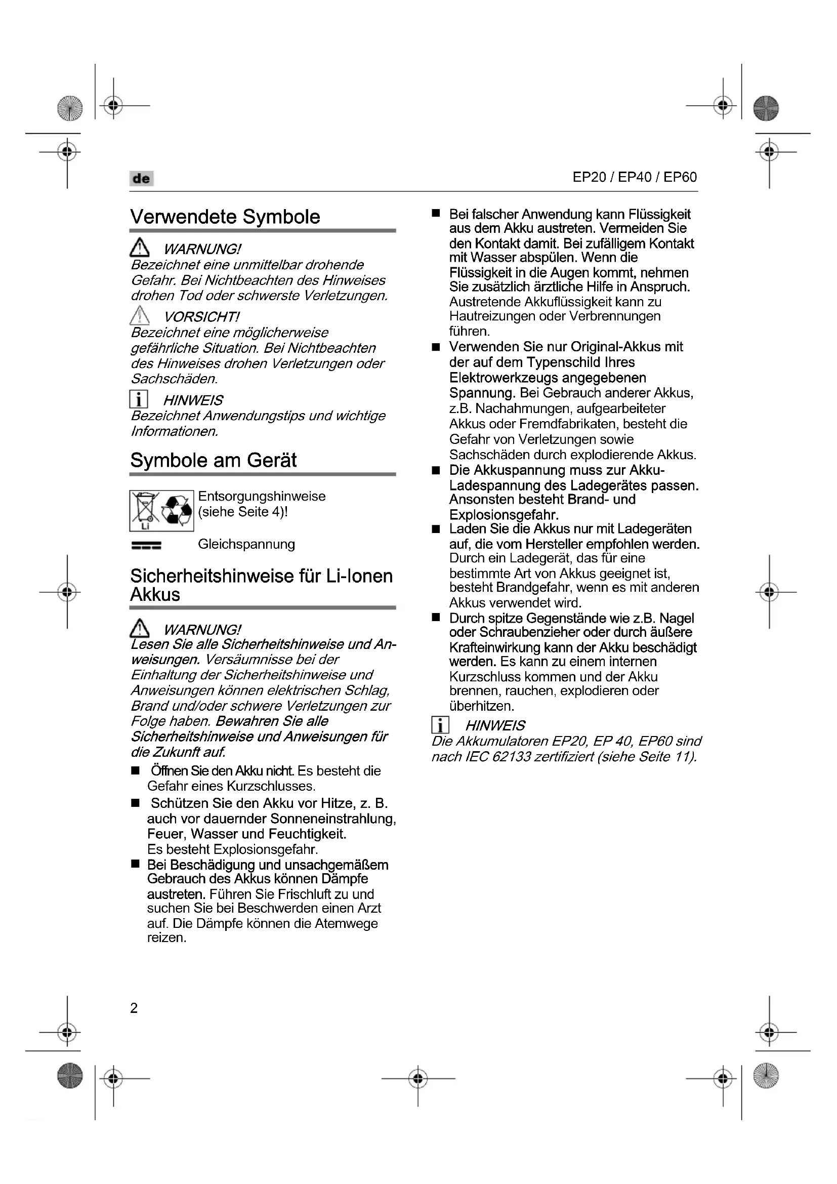 Durch spitze Gegenstände wie z.B. Nagel oder Schraubenzieher oder durch äußere Krafteinwirkung kann der Akku beschädigt werden. Es kann zu einem internen Kurzschluss kommen und der Akku brennen, rauchen, explodieren oder überhitzen. HINWEIS Die Akkumulatoren EP20, EP 40, EP60 sind nach IEC 62133 zertifiziert (siehe Seite 11). Entsorgungshinweise (siehe Seite 4)! GleichspannungEP20 / EP40 / EP60