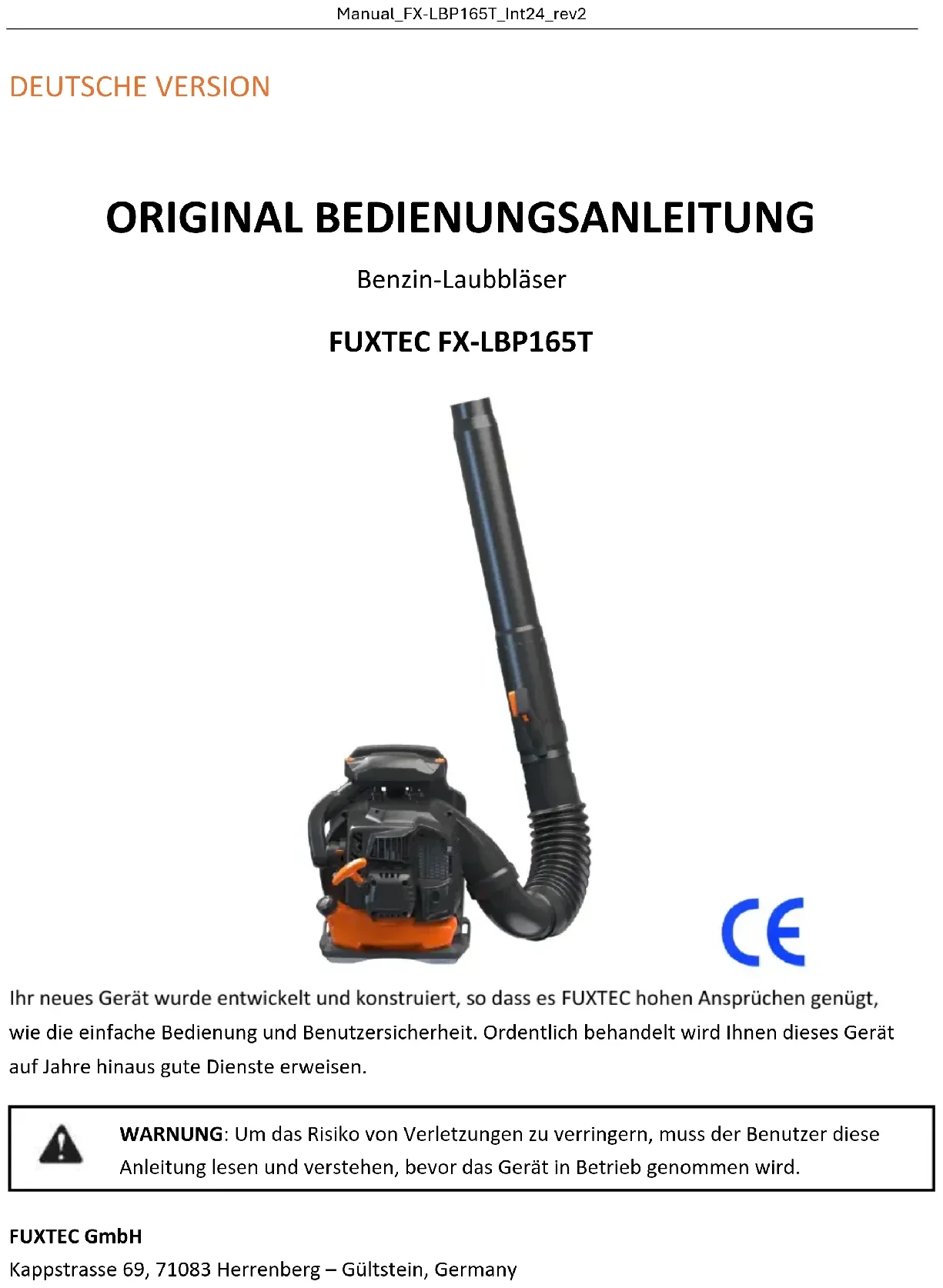 Aufbewahrung der technischen Unterlagen: FUXTEC GmbH, Kappstraße 69, 71083 Herrenberg, Germany L. Zirkler, GeschäftsführungManual_FX-LBP165T_Int24_rev2