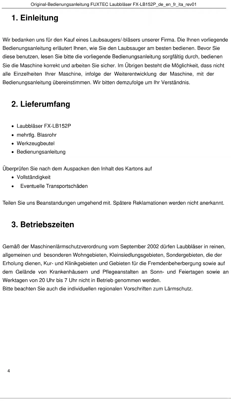 Gemäß der Maschinenlärmschutzverordnung vom September 2002 dürfen Laubbläser in reinen, allgemeinen und besonderen Wohngebieten, Kleinsiedlungsgebieten, Sondergebieten, die der Erholung dienen, Kur- und Klinikgebieten und Gebieten für die Fremdenbeherbergung sowie auf dem Gelände von Krankenhäusern und Pflegeanstalten an Sonn- und Feiertagen sowie an Werktagen von 20 Uhr bis 7 Uhr nicht in Betrieb genommen werden. Bitte beachten Sie auch die individuellen regionalen Vorschriften zum Lärmschutz.Original-Bedienungsanleitung FUXTEC Laubbläser FX-LB152P_de_en_fr_ita_rev01