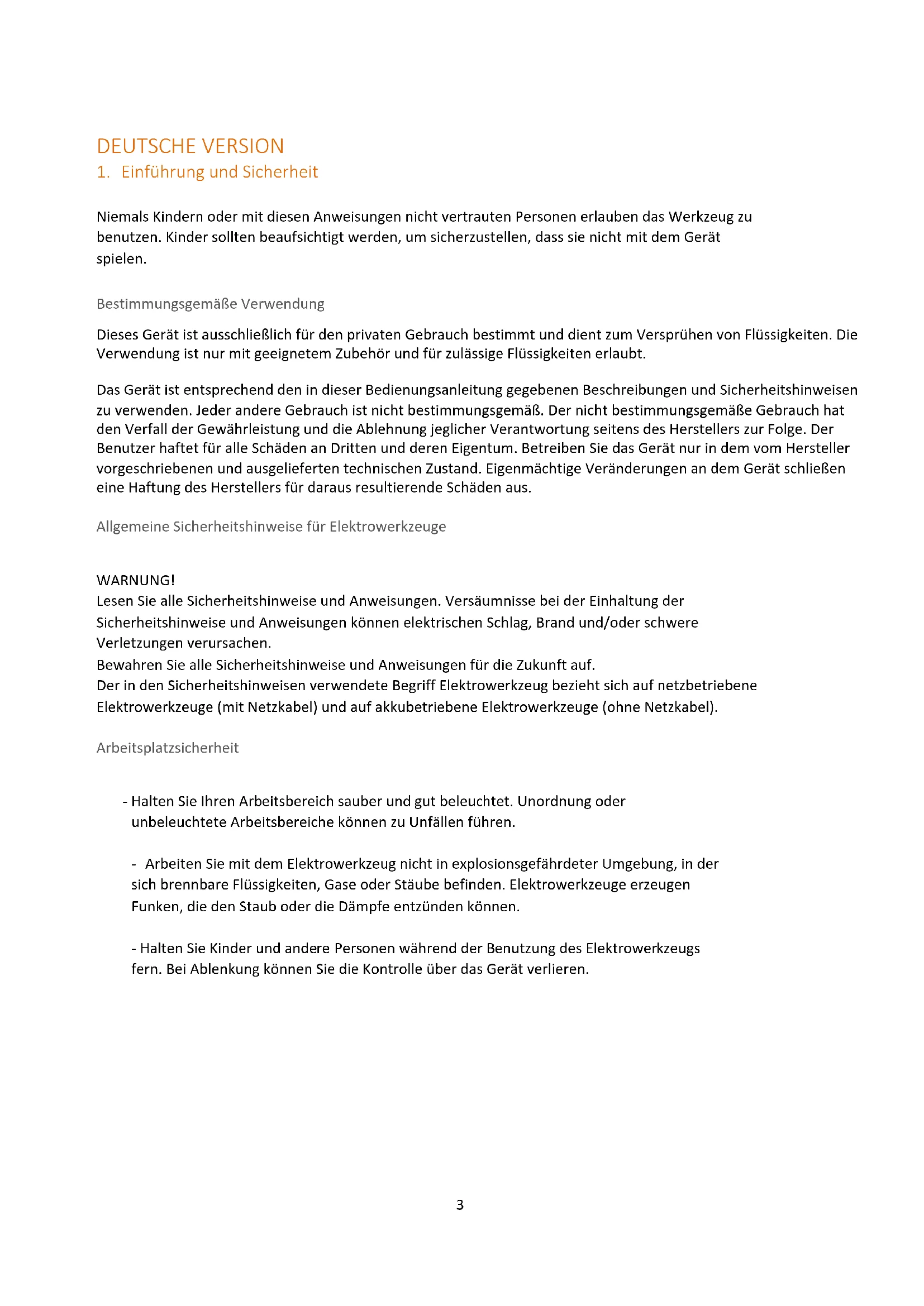 Niemals Kindern oder mit diesen Anweisungen nicht vertrauten Personen erlauben das Werkzeug zu benutzen. Kinder sollten beaufsichtigt werden, um sicherzustellen, dass sie nicht mit dem Gerät spielen. Bestimmungsgemäße Verwendung Dieses Gerät ist ausschließlich für den privaten Gebrauch bestimmt und dient zum Versprühen von Flüssigkeiten. Die Verwendung ist nur mit geeignetem Zubehör und für zulässige Flüssigkeiten erlaubt. Das Gerät ist entsprechend den in dieser Bedienungsanleitung gegebenen Beschreibungen und Sicherheitshinweisen zu verwenden. Jeder andere Gebrauch ist nicht bestimmungsgemäß. Der nicht bestimmungsgemäße Gebrauch hat den Verfall der Gewährleistung und die Ablehnung jeglicher Verantwortung seitens des Herstellers zur Folge. Der Benutzer haftet für alle Schäden an Dritten und deren Eigentum. Betreiben Sie das Gerät nur in dem vom Hersteller vorgeschriebenen und ausgelieferten technischen Zustand. Eigenmächtige Veränderungen an dem Gerät schließen eine Haftung des Herstellers für daraus resultierende Schäden aus. Allgemeine Sicherheitshinweise für Elektrowerkzeuge WARNUNG! Lesen Sie alle Sicherheitshinweise und Anweisungen. Versäumnisse bei der Einhaltung der Sicherheitshinweise und Anweisungen können elektrischen Schlag, Brand und/oder schwere Verletzungen verursachen. Bewahren Sie alle Sicherheitshinweise und Anweisungen für die Zukunft auf. Der in den Sicherheitshinweisen verwendete Begriff Elektrowerkzeug bezieht sich auf netzbetriebene Elektrowerkzeuge (mit Netzkabel) und auf akkubetriebene Elektrowerkzeuge (ohne Netzkabel). Arbeitsplatzsicherheit - Halten Sie Ihren Arbeitsbereich sauber und gut beleuchtet. Unordnung oder unbeleuchtete Arbeitsbereiche können zu Unfällen führen. - Arbeiten Sie mit dem Elektrowerkzeug nicht in explosionsgefährdeter Umgebung, in der sich brennbare Flüssigkeiten, Gase oder Stäube befinden. Elektrowerkzeuge erzeugen Funken, die den Staub oder die Dämpfe entzünden können. - Halten Sie Kinder und andere Personen während der Benutzung des Elektrowerkzeugs fern. Bei Ablenkung können Sie die Kontrolle über das Gerät verlieren.4
