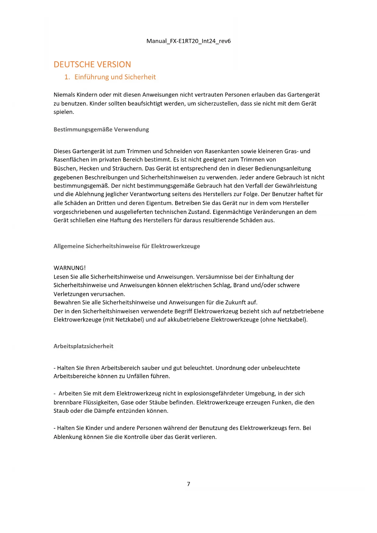 Vor dem Einsatz - Machen Sie sich vor Arbeitsbeginn mit dem Rasentrimmer und seinen Funktionen sowie seinen Bedienelementen vertraut. - Überprüfen Sie das Gerät vor Inbetriebnahme und nach einem Aufprall auf Anzeichen von Verschleiß oder Beschädigung. - Benutzen Sie kein Gerät, dessen Schalter defekt ist und sich nicht mehr ein- oder ausschalten lässt. - Überprüfen Sie, ob alle Muttern, Bolzen und Schrauben festsitzen, um sicherzustellen, dass das Gerät sicher betrieben wird. - Verwenden Sie niemals ein Gerät mit beschädigten oder fehlenden Teilen. Lassen Sie diese von einer dazu qualifizierten Fachkraft oder Fachwerkstatt reparieren oder ggf. austauschen. - Um die Gefahr schwerer Verletzungen zu reduzieren, verwenden Sie niemals Draht oder mit Metall verstärkten Faden als Schneidfaden. - Tragen Sie bei Arbeiten mit oder an dem Gerät immer festes Schuhwerk, lange Hose und die entsprechende persönliche Schutzausrüstung (Schutzbrille, Gehörschutz, griffige Arbeitshandschuhe etc.). Das Tragen von persönlicher Schutzausrüstung verringert das Risiko von Verletzungen. - Tragen Sie keinen Schmuck oder weite Kleidung, die von dem Rasentrimmer erfasst werden könnte. Halten Sie langes Haar von der Spindel fern. - Überprüfen Sie das Gelände, auf dem das Gerät eingesetzt wird und entfernen Sie Steine und Drähte, die von dem Rasentrimmer erfasst werden könnten, damit keine Gefährdung von Personen zustande kommt. - Entfernen Sie Einstellwerkzeuge oder Schraubenschlüssel, bevor Sie den Trimmer einschalten. Ein Werkzeug oder Schlüssel, der sich in einem drehenden Geräteteil befindet, kann zu Verletzungen führen. Beim Einsatz - Nehmen Sie das Gerät nicht in Betrieb, wenn sich Personen (insbesondere Kinder) oder Tiere in unmittelbarer Nähe befinden. - Unterbrechen Sie die Arbeit, wenn Sie bemerken, dass Personen (insbesondere Kinder) oder Haustiere in der Nähe sind.Manual_FX-E1RT20_Int24_rev6