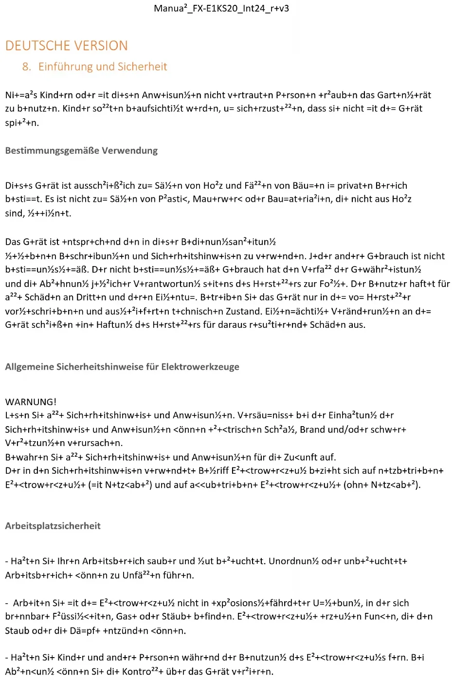 Allgemeine Sicherheitshinweise - Lesen Sie zu Ihrer Sicherheit und für die Sicherheit anderer diese Bedienungsanleitung und ihre Sicherheitshinweise, bevor Sie das Gerät benutzen. Bitte bewahren Sie Bedienungsanleitung und ihre Sicherheitshinweise für den späteren Gebrauch sicher auf und halten diese für jeden Einsatz griffbereit. - Geben Sie die Betriebsanleitung bei einem Besitzerwechsel mit dem Gerät weiter. - Personen, die das Gerät bedienen, dürfen nicht unter dem Einfluss von Rauschmitteln (z. B. Alkohol, Drogen oder Medikamenten) stehen. - Betreiben Sie das Gerät nur in dem vom Hersteller vorgeschriebenen und ausgelieferten technischen Zustand. Eigenmächtige Veränderungen am Gerät schließen eine Haftung des Herstellers für daraus resultierende Schäden aus. - Verwenden Sie das Gerät nur bei Tageslicht oder unter guter künstlicher Beleuchtung. - Verwenden Sie das Gerät nur bei trockenen Wetterbedingungen. Halten Sie es von Regen oder Nässe fern. Das Eindringen von Wasser in das Gerät erhöht das Risiko eines elektrischen Schlags. - Schalten Sie bei folgenden Bedingungen das Gerät ab und entfernen Sie den Akku: wenn das Gerät unbeaufsichtigt gelassen wird;Manual_FX-E1KS20_Int24_rev3
