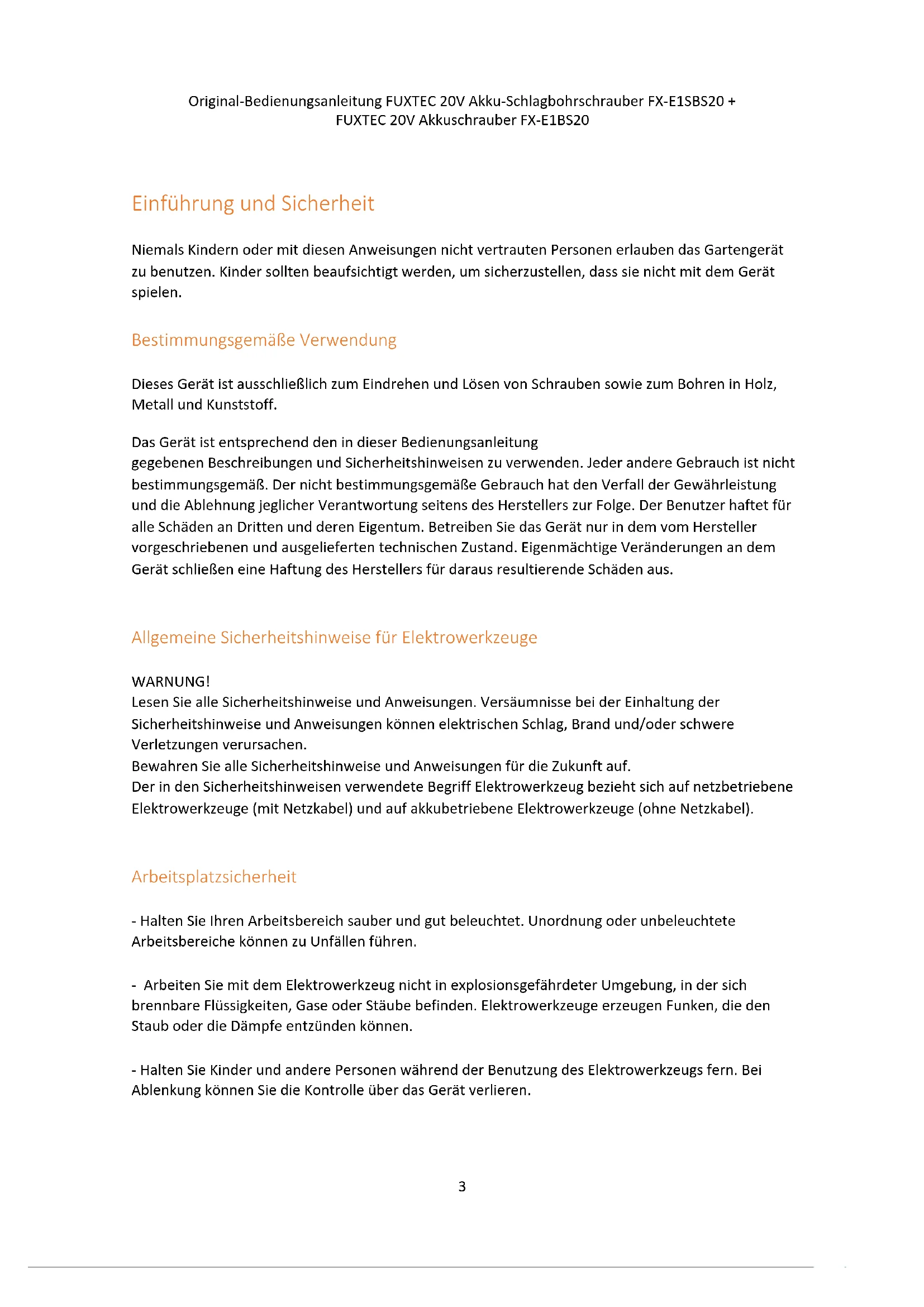 Verwendung und Behandlung des Akkuwerkzeuges - Laden Sie die Akkus nur mit Ladegeräten auf, die vom Hersteller empfohlen werden. Durch ein Ladegerät, das für eine bestimmte Art von Akkus geeignet ist, besteht Brandgefahr, wenn es mit anderen Akkus verwendet wird. - Verwenden Sie nur die dafür vorgesehenen Akkus in den Elektrowerkzeugen. Der Gebrauch von anderen Akkus kann zu Verletzungen und Brandgefahr führen. - Halten Sie den nicht benutzten Akku fern von Büroklammern, Münzen, Schlüsseln, Nägeln, Schrauben oder anderen kleinen Metallgegenständen, die eine Überbrückung der Kontakte verursachen könnten. Ein Kurzschluss zwischen den Akkukontakten kann Verbrennungen oder Feuer zur Folge haben. - Bei falscher Anwendung kann Flüssigkeit aus dem Akku austreten. Vermeiden Sie den Kontakt damit. Bei zufälligem Kontakt mit Wasser abspülen. Wenn die Flüssigkeit in die Augen kommt, nehmen Sie zusätzlich ärztliche Hilfe in Anspruch. Austretende Akkuflüssigkeit kann zu Hautreizungen oder Verbrennungen führen. Sicherheitshinweise für Akku-Bohrschrauber Allgemeine Sicherheitshinweise - Lesen Sie zu Ihrer Sicherheit und für die Sicherheit anderer diese Bedienungsanleitung und ihre Sicherheitshinweise, bevor Sie das Gerät benutzen. Bitte bewahren Sie Bedienungsanleitung und ihre Sicherheitshinweise für den späteren Gebrauch sicher auf und halten diese für jeden Einsatz griffbereit. - Geben Sie die Betriebsanleitung bei einem Besitzerwechsel mit dem Gerät weiter. - Personen, die das Gerät bedienen, dürfen nicht unter dem Einfluss von Rauschmitteln (z. B. Alkohol, Drogen oder Medikamenten) stehen. - Betreiben Sie das Gerät nur in dem vom Hersteller vorgeschriebenen und ausgelieferten technischen Zustand. Eigenmächtige Veränderungen am Gerät schließen eine Haftung des Herstellers für daraus resultierende Schäden aus. - Verwenden Sie das Gerät nur bei Tageslicht oder unter guter künstlicher Beleuchtung. - Verwenden Sie das Gerät nur bei trockenen Wetterbedingungen. Halten Sie es von Regen oder Nässe fern. Das Eindringen von Wasser in das Gerät erhöht das Risiko eines elektrischen Schlags. - Schalten Sie bei folgenden Bedingungen das Gerät ab und entfernen Sie den Akku: ⬧ wenn das Gerät unbeaufsichtigt gelassen wird; ⬧ vor der Überprüfung, Reinigung oder sonstigen Arbeiten am Gerät; ⬧ wenn das Gerät beginnt, übermäßig stark zu vibrieren.Original-Bedienungsanleitung FUXTEC 20V Akku-Schlagbohrschrauber FX-E1SBS20 + FUXTEC 20V Akkuschrauber FX-E1BS20