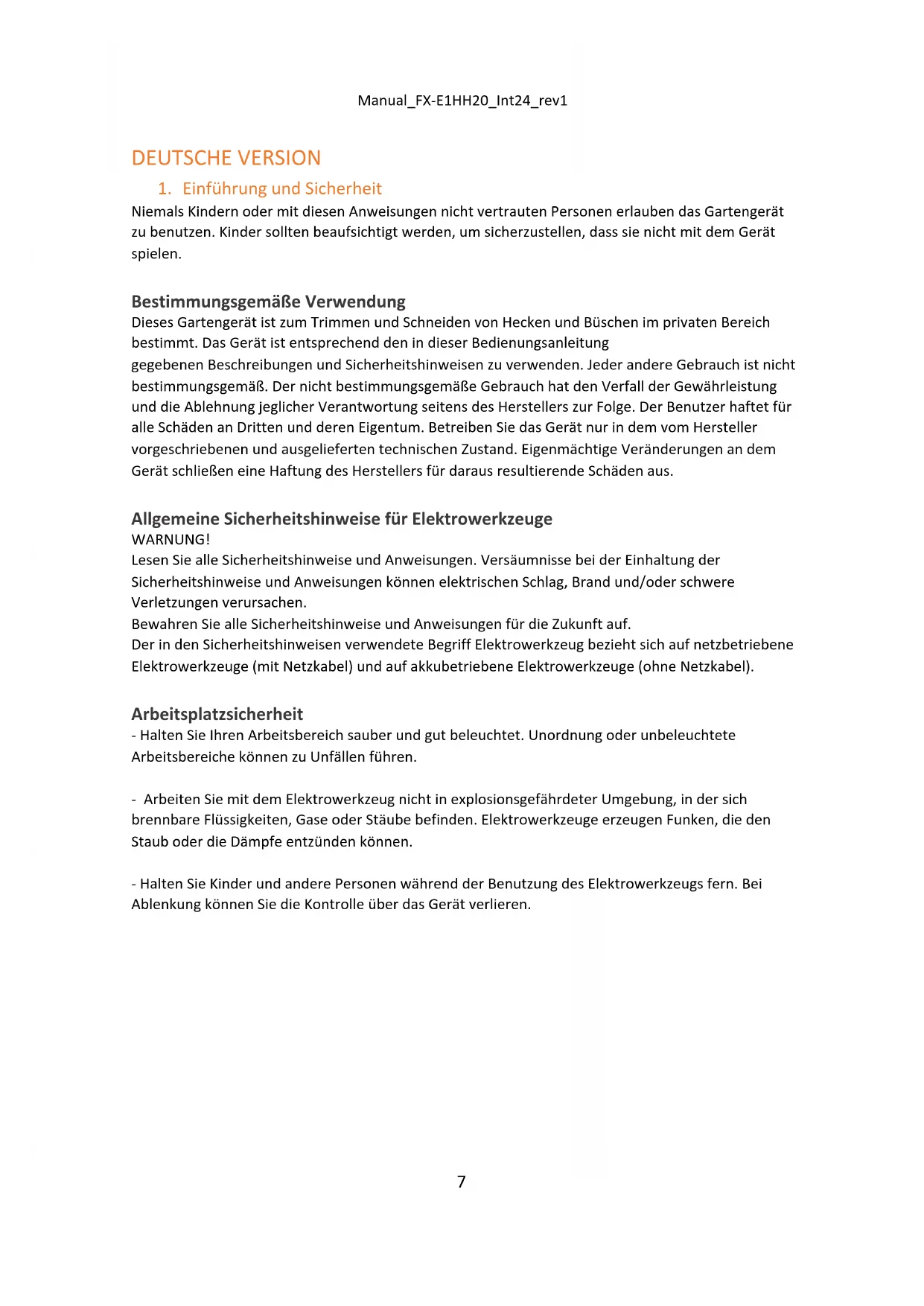 Niemals Kindern oder mit diesen Anweisungen nicht vertrauten Personen erlauben das Gartengerät zu benutzen. Kinder sollten beaufsichtigt werden, um sicherzustellen, dass sie nicht mit dem Gerät spielen. Bestimmungsgemäße Verwendung Dieses Gartengerät ist zum Trimmen und Schneiden von Hecken und Büschen im privaten Bereich bestimmt. Das Gerät ist entsprechend den in dieser Bedienungsanleitung gegebenen Beschreibungen und Sicherheitshinweisen zu verwenden. Jeder andere Gebrauch ist nicht bestimmungsgemäß. Der nicht bestimmungsgemäße Gebrauch hat den Verfall der Gewährleistung und die Ablehnung jeglicher Verantwortung seitens des Herstellers zur Folge. Der Benutzer haftet für alle Schäden an Dritten und deren Eigentum. Betreiben Sie das Gerät nur in dem vom Hersteller vorgeschriebenen und ausgelieferten technischen Zustand. Eigenmächtige Veränderungen an dem Gerät schließen eine Haftung des Herstellers für daraus resultierende Schäden aus. Allgemeine Sicherheitshinweise für Elektrowerkzeuge WARNUNG! Lesen Sie alle Sicherheitshinweise und Anweisungen. Versäumnisse bei der Einhaltung der Sicherheitshinweise und Anweisungen können elektrischen Schlag, Brand und/oder schwere Verletzungen verursachen. Bewahren Sie alle Sicherheitshinweise und Anweisungen für die Zukunft auf. Der in den Sicherheitshinweisen verwendete Begriff Elektrowerkzeug bezieht sich auf netzbetriebene Elektrowerkzeuge (mit Netzkabel) und auf akkubetriebene Elektrowerkzeuge (ohne Netzkabel). Arbeitsplatzsicherheit - Halten Sie Ihren Arbeitsbereich sauber und gut beleuchtet. Unordnung oder unbeleuchtete Arbeitsbereiche können zu Unfällen führen. - Arbeiten Sie mit dem Elektrowerkzeug nicht in explosionsgefährdeter Umgebung, in der sich brennbare Flüssigkeiten, Gase oder Stäube befinden. Elektrowerkzeuge erzeugen Funken, die den Staub oder die Dämpfe entzünden können. - Halten Sie Kinder und andere Personen während der Benutzung des Elektrowerkzeugs fern. Bei Ablenkung können Sie die Kontrolle über das Gerät verlieren.Manual_FX-E1HH20_Int24_rev1