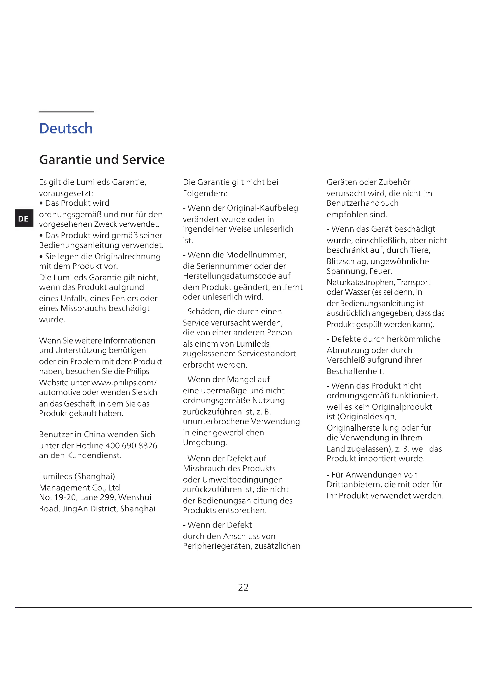 - Sie legen die Originalrechnung mit dem Produkt vor. Die Lumileds Garantie gilt nicht, wenn das Produkt aufgrund eines Unfalls, eines Fehlers oder eines Missbrauchs beschädigt wurde. Wenn Sie weitere Informationen und Unterstützung benötigen oder ein Problem mit dem Produkt haben, besuchen Sie die Philips Website unter www.philips.com/ automotive oder wenden Sie sich an das Geschäft, in dem Sie das Produkt gekauft haben. Benutzer in China wenden Sich unter der Hotline 400 690 8826 an den Kundendienst. Lumileds (Shanghai) Management Co., Ltd No. 19-20, Lane 299, Wenshui Road, JingAn District, Shanghai Die Garantie gilt nicht bei Folgendem: - Wenn der Original-Kaufbeleg verändert wurde oder in irgendeiner Weise unleserlich ist. - Wenn die Modellnummer, die Seriennummer oder der Herstellungsdatumscode auf dem Produkt geändert, entfernt oder unleserlich wird. - Schäden, die durch einen Service verursacht werden, die von einer anderen Person als einem von Lumileds zugelassenem Servicestandort erbracht werden. - Wenn der Mangel auf eine übermäßige und nicht ordnungsgemäße Nutzung zurückzuführen ist, z. B. ununterbrochene Verwendung in einer gewerblichen Umgebung. - Wenn der Defekt auf Missbrauch des Produkts oder Umweltbedingungen zurückzuführen ist, die nicht der Bedienungsanleitung des Produkts entsprechen. - Wenn der Defekt durch den Anschluss von Peripheriegeräten, zusätzlichen Geräten oder Zubehör verursacht wird, die nicht im Benutzerhandbuch empfohlen sind. - Wenn das Gerät beschädigt wurde, einschließlich, aber nicht beschränkt auf, durch Tiere, Blitzschlag, ungewöhnliche Spannung, Feuer, Naturkatastrophen, Transport oder Wasser (es sei denn, in der Bedienungsanleitung ist ausdrücklich angegeben, dass das Produkt gespült werden kann). - Defekte durch herkömmliche Abnutzung oder durch Verschleiß aufgrund ihrer Beschaenheit. - Wenn das Produkt nicht ordnungsgemäß funktioniert, weil es kein Originalprodukt ist (Originaldesign, Originalherstellung oder für die Verwendung in Ihrem Land zugelassen), z. B. weil das Produkt importiert wurde. - Für Anwendungen von Drittanbietern, die mit oder für Ihr Produkt verwendet werden. Garantie und Service DE23 1 m Wichtige Informationen Beim Reinigen des Geräts dürfen keine Flüssigkeiten wie Wasser, Reinigungsmittel oder brennbare Lösungsmittel auf das Gerät gegossen werden. HaltenSiedenAroma-Diusor vonjeglichenHindernissenfern Nicht abdecken! Zur Reinigung des Aroma- Diusors: