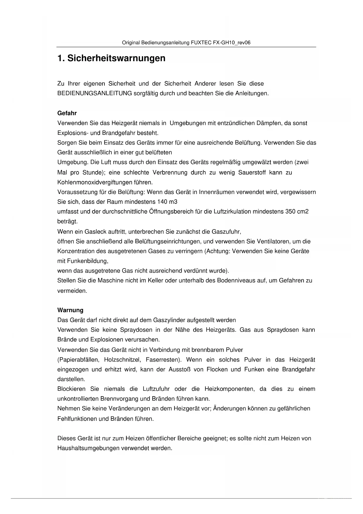 Zu Ihrer eigenen Sicherheit und der Sicherheit Anderer lesen Sie diese BEDIENUNGSANLEITUNG sorgfältig durch und beachten Sie die Anleitungen. Gefahr Verwenden Sie das Heizgerät niemals in Umgebungen mit entzündlichen Dämpfen, da sonst Explosions- und Brandgefahr besteht. Sorgen Sie beim Einsatz des Geräts immer für eine ausreichende Belüftung. Verwenden Sie das Gerät ausschließlich in einer gut belüfteten Umgebung. Die Luft muss durch den Einsatz des Geräts regelmäßig umgewälzt werden (zwei Mal pro Stunde); eine schlechte Verbrennung durch zu wenig Sauerstoff kann zu Kohlenmonoxidvergiftungen führen. Voraussetzung für die Belüftung: Wenn das Gerät in Innenräumen verwendet wird, vergewissern Sie sich, dass der Raum mindestens 140 m3 umfasst und der durchschnittliche Öffnungsbereich für die Luftzirkulation mindestens 350 cm2 beträgt. Wenn ein Gasleck auftritt, unterbrechen Sie zunächst die Gaszufuhr, öffnen Sie anschließend alle Belüftungseinrichtungen, und verwenden Sie Ventilatoren, um die Konzentration des ausgetretenen Gases zu verringern (Achtung: Verwenden Sie keine Geräte mit Funkenbildung, wenn das ausgetretene Gas nicht ausreichend verdünnt wurde). Stellen Sie die Maschine nicht im Keller oder unterhalb des Bodenniveaus auf, um Gefahren zu vermeiden. Warnung Das Gerät darf nicht direkt auf dem Gaszylinder aufgestellt werden Verwenden Sie keine Spraydosen in der Nähe des Heizgeräts. Gas aus Spraydosen kann Brände und Explosionen verursachen. Verwenden Sie das Gerät nicht in Verbindung mit brennbarem Pulver (Papierabfällen, Holzschnitzel, Faserresten). Wenn ein solches Pulver in das Heizgerät eingezogen und erhitzt wird, kann der Ausstoß von Flocken und Funken eine Brandgefahr darstellen. Blockieren Sie niemals die Luftzufuhr oder die Heizkomponenten, da dies zu einem unkontrollierten Brennvorgang und Bränden führen kann. Nehmen Sie keine Veränderungen an dem Heizgerät vor; Änderungen können zu gefährlichen Fehlfunktionen und Bränden führen. Dieses Gerät ist nur zum Heizen öffentlicher Bereiche geeignet; es sollte nicht zum Heizen von Haushaltsumgebungen verwendet werden.Original Bedienungsanleitung FUXTEC FX-GH10_rev06
