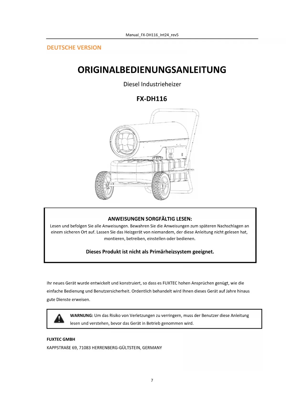 DEUTSCHE VERSION ORIGINALBEDIENUNGSANLEITUNG Diesel Industrieheizer FX-DH116