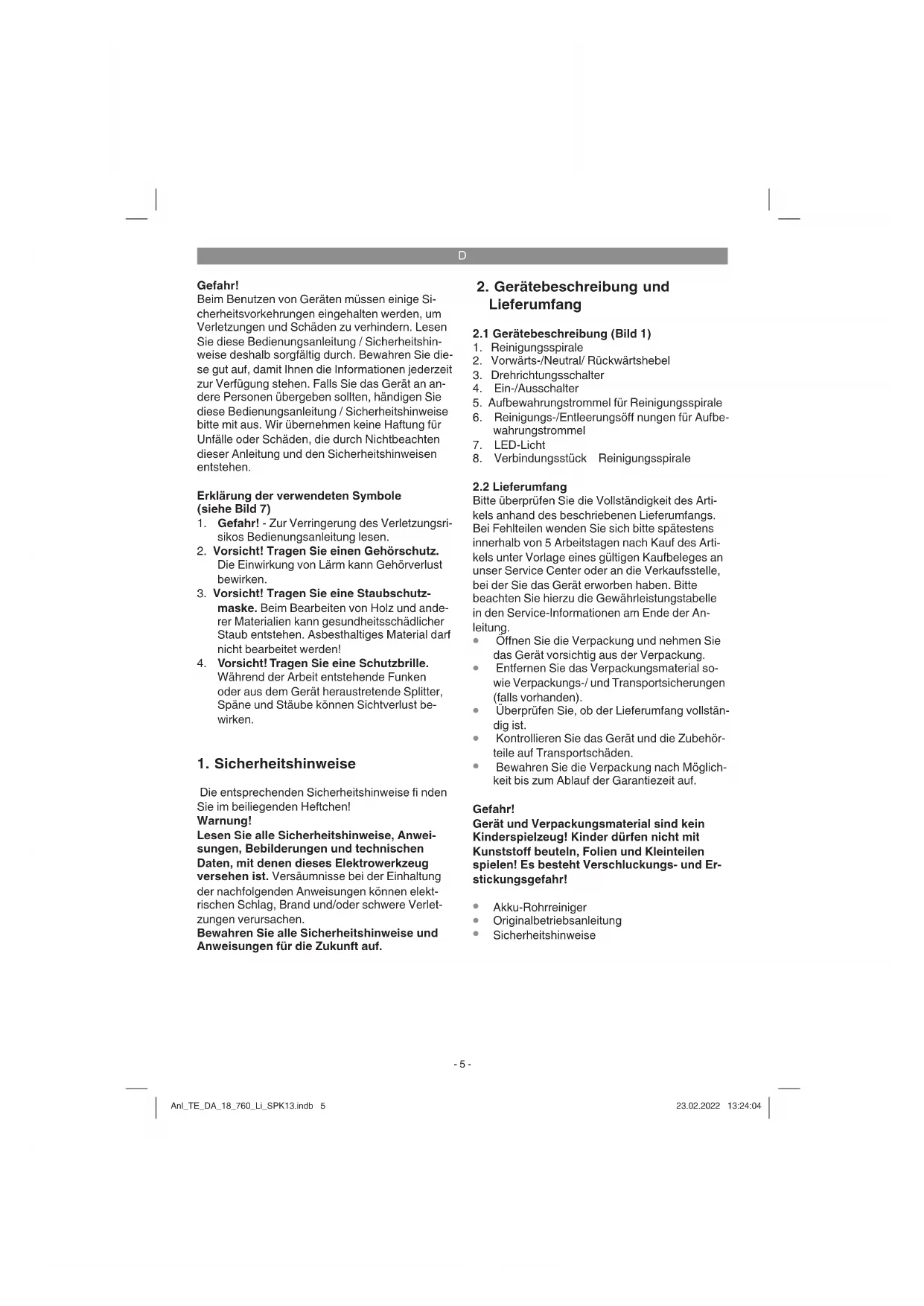 Gefahr! Arbeiten Sie mit der Maschine immer so nah wie möglich am Rohrzugang. Dadurch wird verhindert, dass Sie mit der sich drehenden Rei- nigungsspirale in Berührung kommen und sich verletzten können. Um eine Verstopfung in einem Rohr zu lösen, arbeiten Sie mit dem Rechtslauf der Maschine. Dabei wird die Reinigungsspirale, wie bei einem Korkenzieher, in die Verstopfung (z.B. Toiletten- papier o.ä.) gedreht und bleibt an dieser hängen. Anschließend kann die Verstopfung durch mehr- faches aus- und wieder einfahren der Reinigungs- spirale mit dem Vorwärts-/Neutral/ Rückwärtshe- bel (2) gelöst werden und anschließend aus dem Rohr entfernt werden. Nachdem die Verstopfung entfernt wurde, sollte das Ergebnis mit ausreichend Wasser überprüft und der Vorgang ggf. so oft wiederholt werden, bis das Rohr wieder komplett frei ist. Bei Verstopfungen, die nicht an der Reinigungs- spirale hängen bleiben (z.B. Seifenreste), wird die Verstopfung, durch die Rotation der Reinigungs- spirale, vom Rohr gelöst und kann dann ebenfalls mit ausreichend Wasser aus dem Rohr gespült werden. Auch hier muss der Vorgang so oft/lange wiederholt werden, bis das Rohr wieder komplett frei ist. Sie können die Reinigungsspirale (1) auch ma- nuell herausziehen (siehe Bild 6). Schalten Sie hierzu den Vorwärts-/Neutral/ Rückwärtshebel (2) in die Neutral-Stellung und ziehen Sie die Spirale dann aus dem Gerät. Sollte sich die Reinigungsspirale beim Reini- gungsvorgang festsetzen und kann durch ein- faches zurückziehen nicht mehr aus dem Rohr entfernt werden, schalten Sie den Drehrichtungs- schalter (3) in Schaltstellung L und versuchen erneut die Reinigungsspirale aus dem Rohr zu entfernen. Anl_TE_DA_18_760_Li_SPK13.indb 7Anl_TE_DA_18_760_Li_SPK13.indb 7 23.02.2022 13:24:0523.02.2022 13:24:05D
