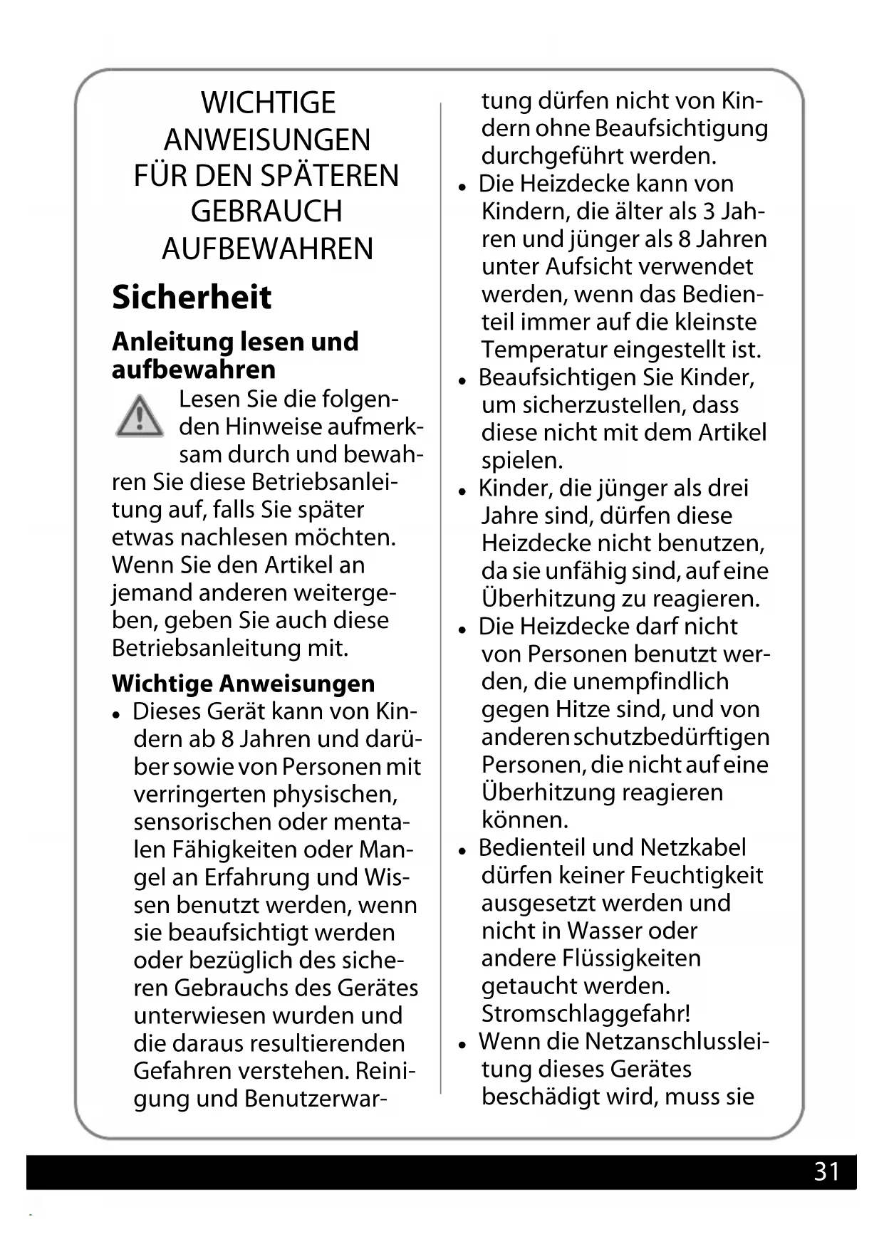 GEBRAUCH AUFBEWAHREN Sicherheit Anleitung lesen und aufbewahren Lesen Sie die folgen- den Hinweise aufmerk- sam durch und bewah- ren Sie diese Betriebsanlei- tung auf, falls Sie später etwas nachlesen möchten. Wenn Sie den Artikel an jemand anderen weiterge- ben, geben Sie auch diese Betriebsanleitung mit. Wichtige Anweisungen Dieses Gerät kann von Kin- dern ab 8 Jahren und darü- ber sowie von Personen mit verringerten physischen, sensorischen oder menta- len Fähigkeiten oder Man- gel an Erfahrung und Wis- sen benutzt werden, wenn sie beaufsichtigt werden oder bezüglich des siche- ren Gebrauchs des Gerätes unterwiesen wurden und die daraus resultierenden Gefahren verstehen. Reini- gung und Benutzerwar- tung dürfen nicht von Kin- dern ohne Beaufsichtigung durchgeführt werden. Die Heizdecke kann von Kindern, die älter als 3 Jah- ren und jünger als 8 Jahren unter Aufsicht verwendet werden, wenn das Bedien- teil immer auf die kleinste Temperatur eingestellt ist. Beaufsichtigen Sie Kinder, um sicherzustellen, dass diese nicht mit dem Artikel spielen. Kinder, die jünger als drei Jahre sind, dürfen diese Heizdecke nicht benutzen, da sie unfähig sind, auf eine Überhitzung zu reagieren. Die Heizdecke darf nicht von Personen benutzt wer- den, die unempfindlich gegen Hitze sind, und von anderen schutzbedürftigen Personen, die nicht auf eine Überhitzung reagieren können. Bedienteil und Netzkabel dürfen keiner Feuchtigkeit ausgesetzt werden und nicht in Wasser oder andere Flüssigkeiten getaucht werden. Stromschlaggefahr! Wenn die Netzanschlusslei- tung dieses Gerätes beschädigt wird, muss sie Druckbuch Kuschelheizdecke BEL.book Seite 31 Dienstag, 11. April 2023 8:11 0832 durch den Hersteller, sei- nen Kundendienst oder eine ähnlich qualifizierte Person ersetzt werden, um Gefährdungen zu vermei- den. Verwendungszweck Die elektrische Heizdecke ist für den in dieser Anlei- tung beschriebenen Gebrauch im privaten Haushalt konzipiert. Die Heizdecke darf nur als Zudecke verwendet wer- den, nicht als Unterlage. Für den medizinischen Ein- satz in Krankenhäusern, Praxen etc. ist sie nicht geeignet. Die Heizdecke ist kein medizinisches Gerät und nicht für therapeuti- sche Zwecke geeignet. Säuglinge, Kleinkinder, hilf- lose oder wärmeunemp- findliche Personen sowie Tiere dürfen mit der Heiz- decke nicht erwärmt wer- den. Die Heizdecke darf nur in trockenen Innenräumen verwendet werden. Gefahr für Kinder Halten Sie Verpackungs- beutel und -folien von Babys und Kleinkindern fern, es besteht Ersti- ckungsgefahr! Gefahr durch Elektrizität Schließen Sie die Heizde- cke an eine ordnungsge- mäß installierte Steckdose an, deren Spannung den „Technischen Daten“ ent- spricht. Achten Sie darauf, dass die Steckdose gut zugänglich ist, damit Sie im Bedarfsfall schnell den Netzstecker ziehen können. Benutzen Sie die Heizdecke nicht: – wenn Heizdecke, Netzka- bel, Bedienteil oder Netz- stecker beschädigt sind, – wenn die Heizdecke feucht ist. Wickeln Sie das Netzkabel vor dem Anschluss voll- ständig ab. Achten Sie dabei darauf, dass das Netzkabel nicht durch scharfe Kanten oder heiße Gegenstände beschädigt wird. Ziehen Sie den Netzstecker aus der Steckdose: – wenn Sie die Heizfunkti- on nicht benutzen, – nach jedem Gebrauch, – bevor Sie die Heizdecke reinigen oder weglegen, Druckbuch Kuschelheizdecke BEL.book Seite 32 Dienstag, 11. April 2023 8:11 0833 – wenn während des Betriebs offensichtlich eine Störung auftritt, – bei Gewitter. Ziehen Sie dabei immer am Netzstecker, nicht am Netz- kabel. Nehmen Sie keine Verän- derungen am Artikel oder am Anschlusskabel vor. Lassen Sie Reparaturen nur von einer Fachwerkstatt durchführen, da nicht fach- gerecht reparierte Geräte den Benutzer gefährden. Beachten Sie auch die bei- liegenden Garantiebedin- gungen. Zum Anschluss der Heizde- cke nur das mitgelieferte Bedienteil Typ GT-HD-06 verwenden. Entfernen Sie vor dem Waschen das Bedienteil von der Heizdecke. Waschen Sie die Heizdecke nur gemäß der Angaben auf dem Etikett. Gefahr von gesundheitlichen Schäden Eine lange Anwendung auf höchster Stufe kann zu Hautirritationen, Verbren- nungen oder Hitzschlag führen. Wählen Sie bei län- gerem Gebrauch eine geringe Heizstufe (1 oder 2). Gefahr von Unfällen Vermeiden Sie den Gebrauch von Verlänge- rungskabeln. Gerade beim Aufstehen besteht Stolper- gefahr durch verknotete, verdrehte oder schlecht verlegte Kabel. Ordnen Sie Netzleitung und Bedienteil so an, das weder Stolper- noch Strangulationsgefahr besteht. Gefahr von Brand Während des Betriebs erwärmt sich das Bedien- teil. Decken Sie es nicht zu oder ab. Speziell wenn Sie es mit der Heizdecke zude- cken, wird das Bedienteil sehr heiß. Achtung - Sachschäden Schalten Sie die Heizdecke nicht ein, wenn sie gefaltet oder zusammengeschoben ist. Ziehen Sie die Heizdecke nicht in einen Bettbezug ein und legen Sie die Heiz- decke nicht um die Mat- ratze. Die Heizdecke darf nicht eingeklemmt, scharf geknickt oder in feuchtem Druckbuch Kuschelheizdecke BEL.book Seite 33 Dienstag, 11. April 2023 8:11 0834 Zustand eingeschaltet wer- den. Legen Sie während des Betriebs keine großen oder schweren Gegenstände, wie z. B. Koffer, Woll- und Zudecken und Taschen auf die Heizdecke. Legen Sie während des Betriebs keine Wärmequel- len, wie z. B. Bettflaschen, Heizkissen oder Ähnliches auf die Heizdecke. Stellen Sie vor jedem Gebrauch auf einem ver- stellbaren Bett oder bei geteilten Matratzen sicher, dass die Heizdecke oder das Netzkabel nicht einge- klemmt oder zusammen- geschoben sind. Der Artikel unterliegt einer normalen Alterung. Prüfen Sie deshalb vor jedem Gebrauch, ob Heizdecke, Bedienteil und Netzkabel Anzeichen von Abnutzung oder Beschädigungen zei- gen. Falls solche Anzeichen vorhanden sind oder die Heizdecke unsachgemäß benutzt wurde, muss sie vor erneuter Inbetrieb- nahme von einer Fach- werkstatt geprüft werden. Stecken Sie keine Nadeln oder andere spitze Ge