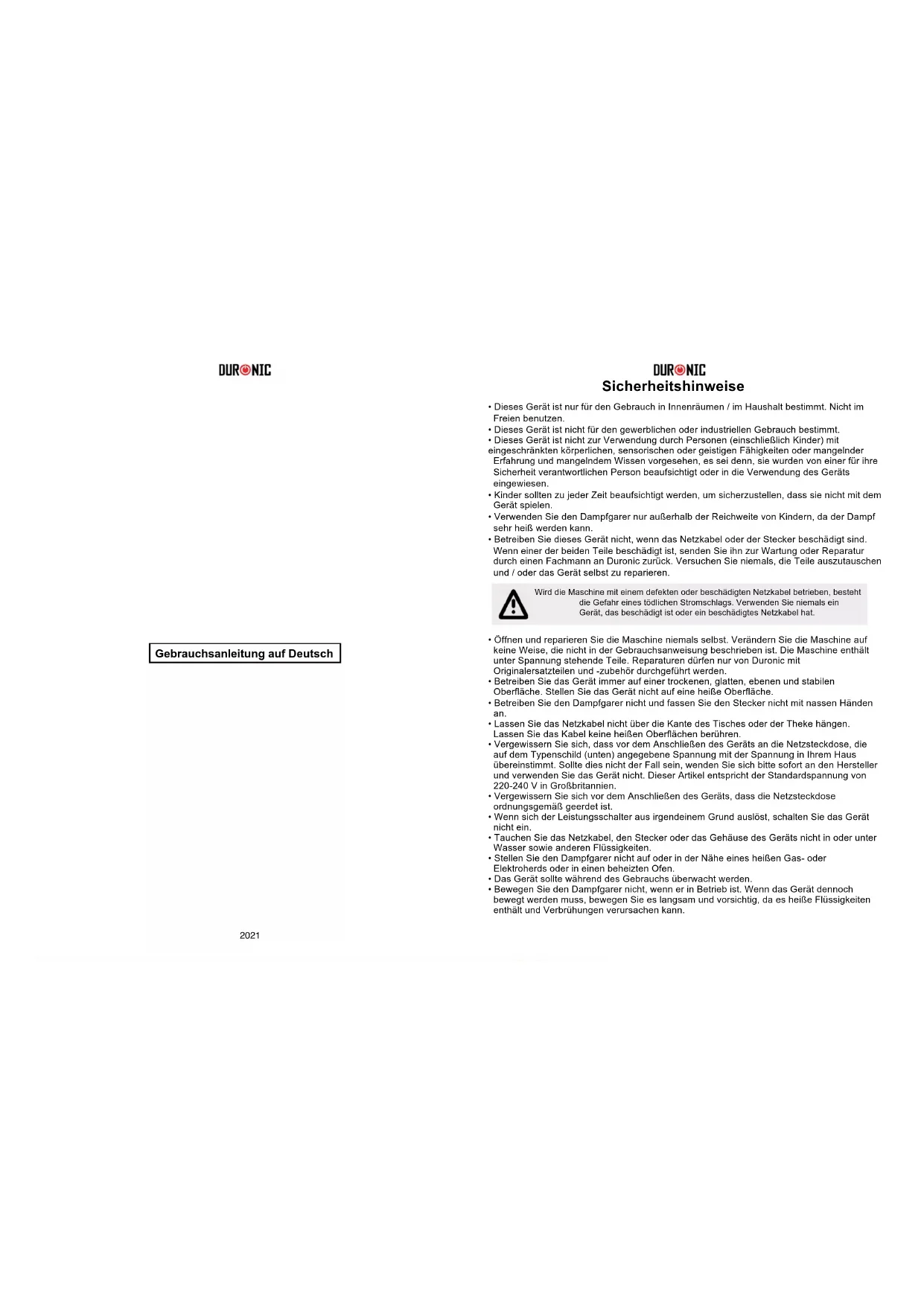 - Betreiben Sie dieses Gerät nicht, wenn das Netzkabel oder der Stecker beschädigt sind. Wenn einer der beiden Teile beschädigt ist, senden Sie ihn zur Wartung oder Reparatur durch einen Fachmann an Duronic zurück. Versuchen Sie niemals, die Teile auszutauschen und / oder das Gerät selbst zu reparieren.