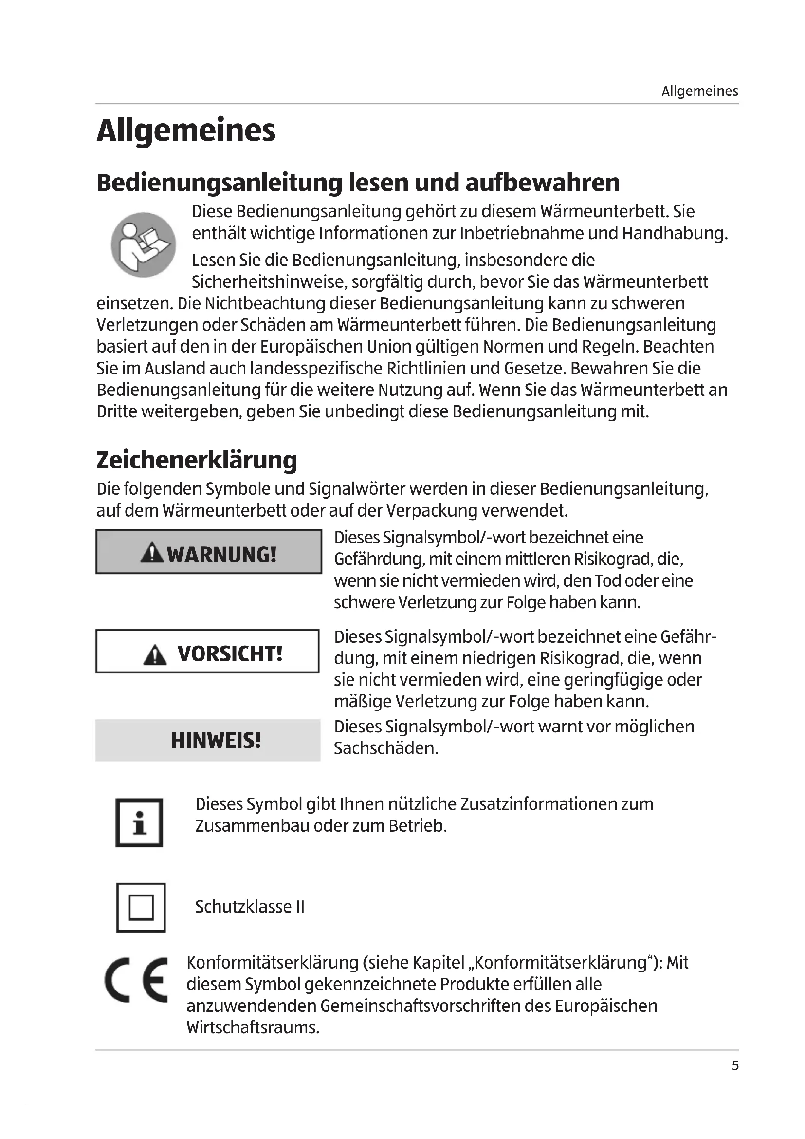 Allgemeines Bedienungsanleitung lesen und aufbewahren Diese Bedienungsanleitung gehört zu diesem Wärmeunterbett. Sie enthält wichtige Informationen zur Inbetriebnahme und Handhabung. Lesen Sie die Bedienungsanleitung, insbesondere die Sicherheitshinweise, sorgfältig durch, bevor Sie das Wärmeunterbett einsetzen. Die Nichtbeachtung dieser Bedienungsanleitung kann zu schweren Verletzungen oder Schäden am Wärmeunterbett führen. Die Bedienungsanleitung basiert auf den in der Europäischen Union gültigen Normen und Regeln. Beachten Sie im Ausland auch landesspezifische Richtlinien und Gesetze. Bewahren Sie die Bedienungsanleitung für die weitere Nutzung auf. Wenn Sie das Wärmeunterbett an Dritte weitergeben, geben Sie unbedingt diese Bedienungsanleitung mit. Zeichenerklärung Die folgenden Symbole und Signalwörter werden in dieser Bedienungsanleitung, auf dem Wärmeunterbett oder auf der Verpackung verwendet. WARNUNG! Dieses Signalsymbol/-wort bezeichnet eine Gefährdung, mit einem mittleren Risikograd, die, wenn sie nicht vermieden wird, den Tod oder eine schwere Verletzung zur Folge haben kann. VORSICHT! Dieses Signalsymbol/-wort bezeichnet eine Gefähr- dung, mit einem niedrigen Risikograd, die, wenn sie nicht vermieden wird, eine geringfügige oder mäßige Verletzung zur Folge haben kann. HINWEIS! Dieses Signalsymbol/-wort warnt vor möglichen Sachschäden. Dieses Symbol gibt Ihnen nützliche Zusatzinformationen zum Zusammenbau oder zum Betrieb. Schutzklasse II Konformitätserklärung (siehe Kapitel „Konformitätserklärung“): Mit diesem Symbol gekennzeichnete Produkte erfüllen alle anzuwendenden Gemeinschaftsvorschriften des Europäischen Wirtschaftsraums.Sicherheit