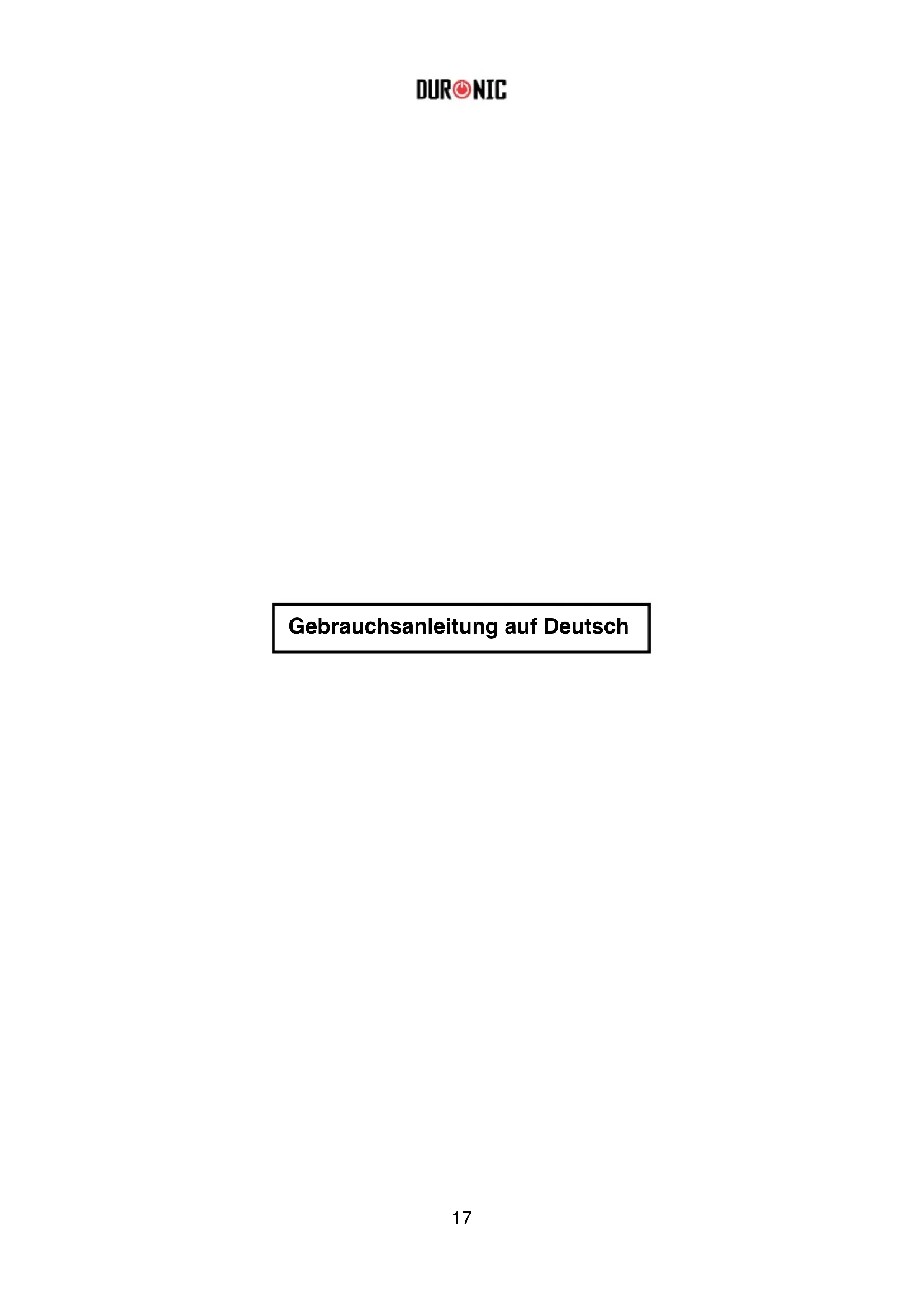 - Öffnen und reparieren Sie das Gerät niemals selbst. Modizieren Sie das Gerät nicht auf eine Weise, die nicht in den Gebrauchsanweisungen beschrieben ist. Das Gerät enthält lebendige Teile. Reparaturen dürfen nur von Duronic unter Verwendung von Originalersatzteilen und Zubehör durchgeführt werden.