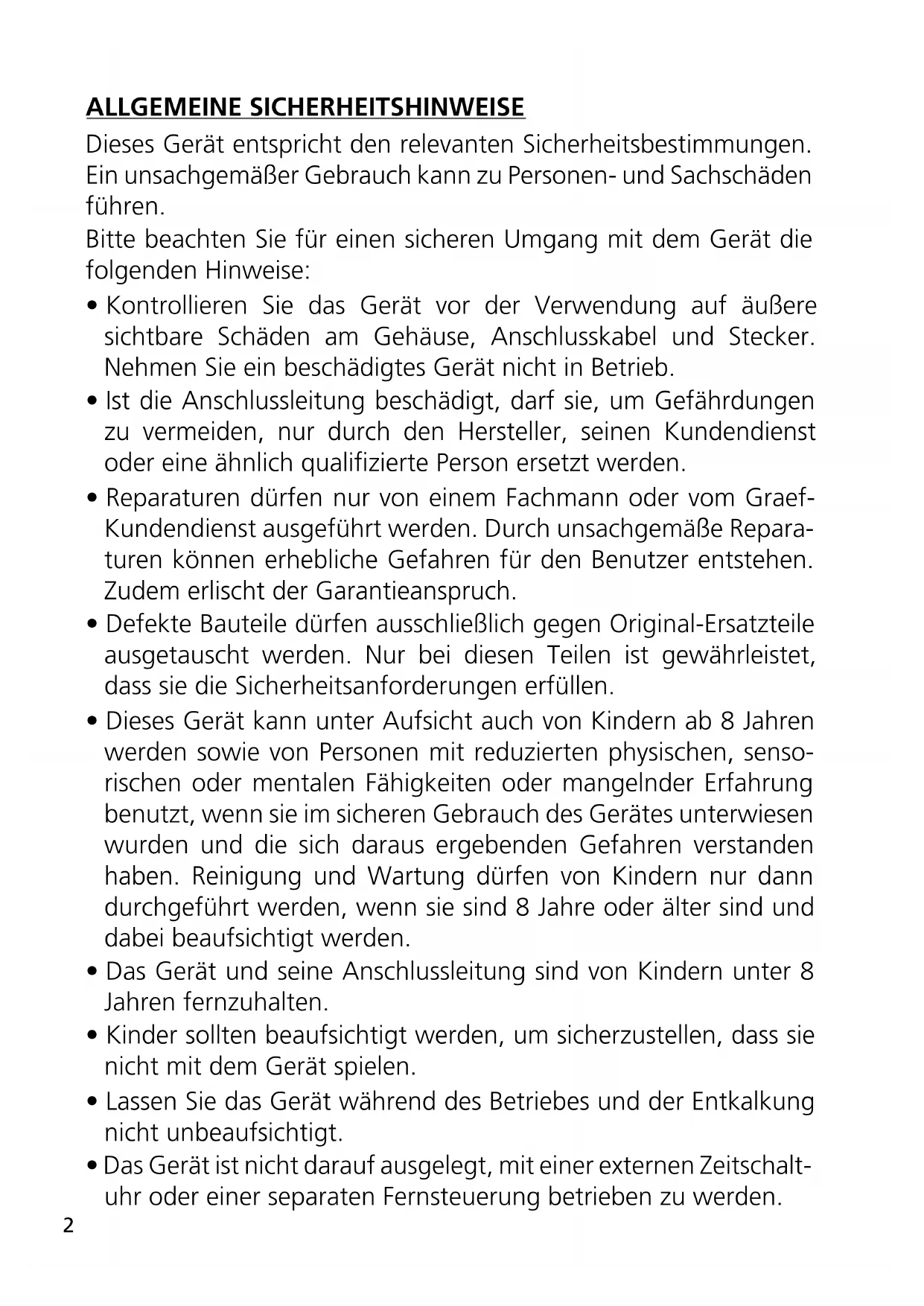 - Reparaturen dürfen nur von einem Fachmann oder vom Graef- Kundendienst ausgeführt werden. Durch unsachgemäße Repara- turen können erhebliche Gefahren für den Benutzer entstehen. Zudem erlischt der Garantieanspruch.