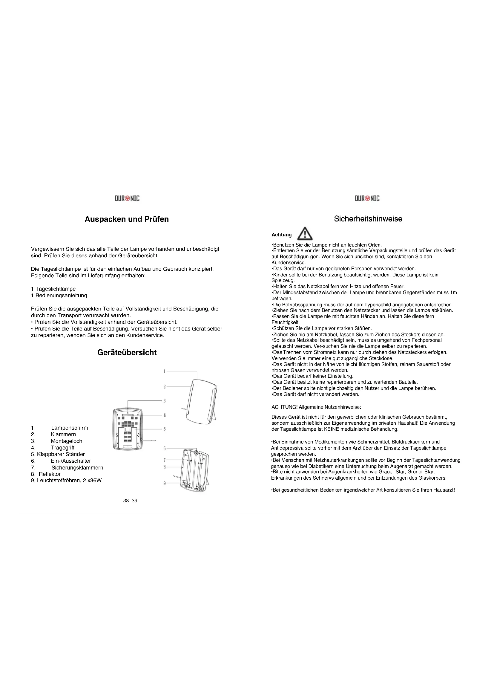 Gebrauchsanleitung auf Deutsch38 39 Geräteübersicht Auspacken und Prüfen Vergewissern Sie sich das alle Teile der Lampe vorhanden und unbeschädigt sind. Prüfen Sie dieses anhand der Geräteübersicht. Die Tageslichtlampe ist für den einfachen Aufbau und Gebrauch konzipiert. Folgende Teile sind im Lieferumfang enthalten: 1 Tageslichtlampe 1 Bedienungsanleitung Prüfen Sie die ausgepackten Teile auf Vollständigkeit und Beschädigung, die durch den Transport verursacht wurden.