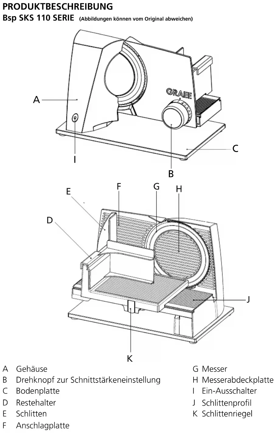 - Die Steckdose muss leicht zugänglich sein, sodass das Stromkabel notfalls schnell abgezogen werden kann. Gefahrenquellen Das sehr scharfe Messer (G) kann schwere Verletzungen verursachen. Gefährdet sind besonders Ihre Finger. Greifen Sie aus diesem Grund nicht in den Raum zwischen Anschlagplatte (F) und Messer (G). Kindersicherung Zur Sicherung des Messers (G) muss die (Anschlagplatte (F) komplett geschlos- sen sein, dann können Sie den Schlit- ten (E) vor das Messer (G) schieben und den Schlittenriegel (K) eindrücken. Der Schlitten (E) sitzt fest und deckt das Messer (G) ab. Schneidgut