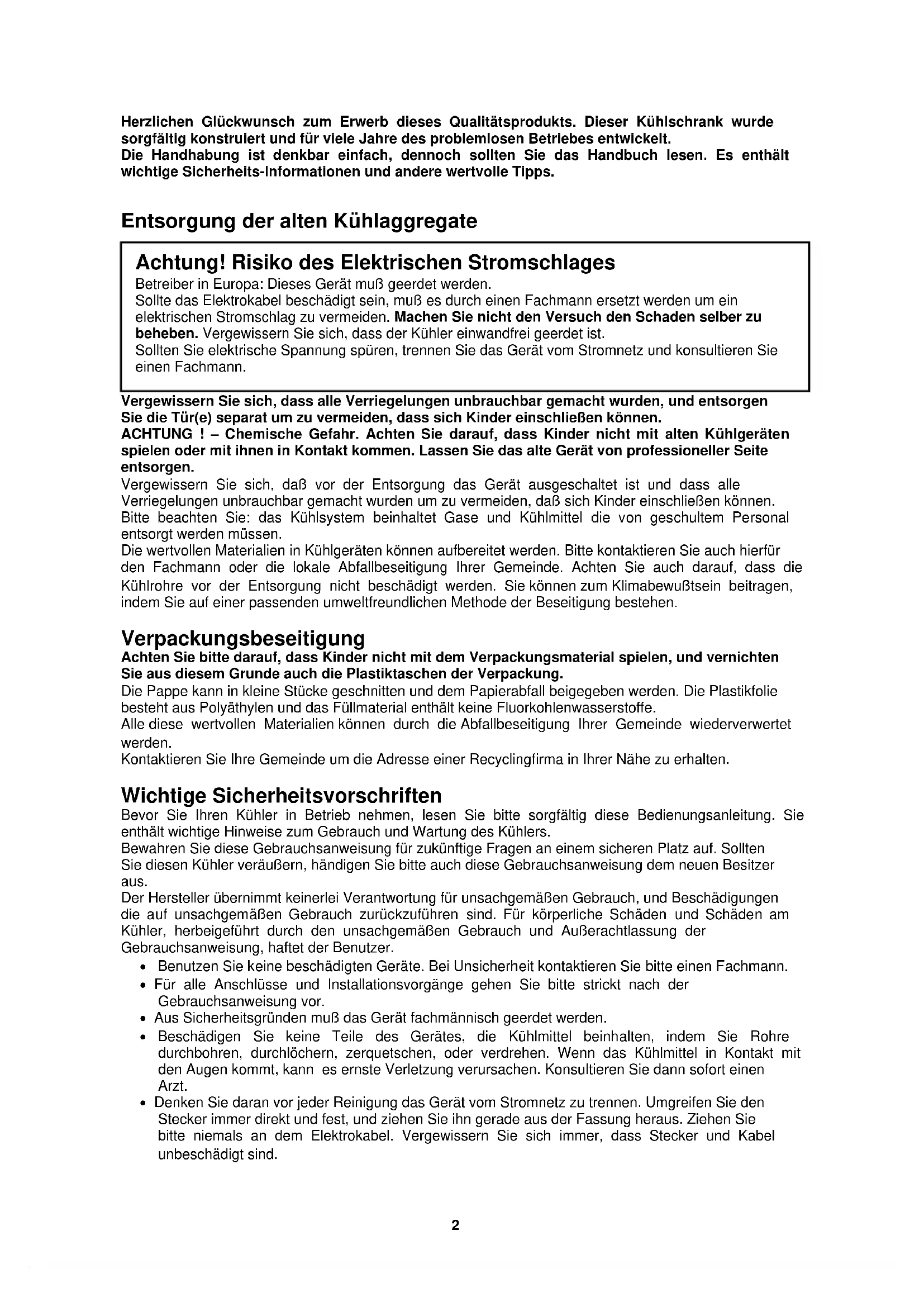 Gebrauchsanweisung • User Manual Guide d'utilisation • Gebruiksaanwijzing Für einen sicheren Betrieb lesen Sie bitte vor dem Gebrauch diese Bedienungsanleitung. Deutsch ....................................................................... Seite 02 To ensure safe operation, please read this instruction manual thoroughly before use. English ......................................................................... Page 05 Afin d'assurer un bon fonctionnement, veuillez lire ce manuel attentivement avant d'utiliser cet appareil. Français ........................................................................ Page 07 Lees de gebruiksaanwijzing aandachtig alvorens het toestel in gebruik te nemen. Nederlands………………………………………………………………………Blz. 092 Herzlichen Glückwunsch zum Erwerb dieses Qualitätsprodukts. Dieser Kühlschrank wurde sorgfältig konstruiert und für viele Jahre des problemlosen Betriebes entwickelt. Die Handhabung ist denkbar einfach, dennoch sollten Sie das Handbuch lesen. Es enthält wichtige Sicherheits-Informationen und andere wertvolle Tipps. Entsorgung der alten Kühlaggregate Vergewissern Sie sich, dass alle Verriegelungen unbrauchbar gemacht wurden, und entsorgen Sie die Tür(e) separat um zu vermeiden, dass sich Kinder einschließen können. ACHTUNG ! – Chemische Gefahr. Achten Sie darauf, dass Kinder nicht mit alten Kühlgeräten spielen oder mit ihnen in Kontakt kommen. Lassen Sie das alte Gerät von professioneller Seite entsorgen. Vergewissern Sie sich, daß vor der Entsorgung das Gerät ausgeschaltet ist und dass alle Verriegelungen unbrauchbar gemacht wurden um zu vermeiden, daß sich Kinder einschließen können. Bitte beachten Sie: das Kühlsystem beinhaltet Gase und Kühlmittel die von geschultem Personal entsorgt werden müssen. Die wertvollen Materialien in Kühlgeräten können aufbereitet werden. Bitte kontaktieren Sie auch hierfür den Fachmann oder die lokale Abfallbeseitigung Ihrer Gemeinde. Achten Sie auch darauf, dass die Kühlrohre vor der Entsorgung nicht beschädigt werden. Sie können zum Klimabewußtsein beitragen, indem Sie auf einer passenden umweltfreundlichen Methode der Beseitigung bestehen. Verpackungsbeseitigung Achten Sie bitte darauf, dass Kinder nicht mit dem Verpackungsmaterial spielen, und vernichten Sie aus diesem Grunde auch die Plastiktaschen der Verpackung. Die Pappe kann in kleine Stücke geschnitten und dem Papierabfall beigegeben werden. Die Plastikfolie besteht aus Polyäthylen und das Füllmaterial enthält keine Fluorkohlenwasserstoffe. Alle diese wertvollen Materialien können durch die Abfallbeseitigung Ihrer Gemeinde wiederverwertet werden. Kontaktieren Sie Ihre Gemeinde um die Adresse einer Recyclingfirma in Ihrer Nähe zu erhalten. Wichtige Sicherheitsvorschriften Bevor Sie Ihren Kühler in Betrieb nehmen, lesen Sie bitte sorgfältig diese Bedienungsanleitung. Sie enthält wichtige Hinweise zum Gebrauch und Wartung des Kühlers. Bewahren Sie diese Gebrauchsanweisung für zukünftige Fragen an einem sicheren Platz auf. Sollten Sie diesen Kühler veräußern, händigen Sie bitte auch diese Gebrauchsanweisung dem neuen Besitzer aus. Der Hersteller übernimmt keinerlei Verantwortung für unsachgemäßen Gebrauch, und Beschädigungen die auf unsachgemäßen Gebrauch zurückzuführen sind. Für körperliche Schäden und Schäden am Kühler, herbeigeführt durch den unsachgemäßen Gebrauch und Außerachtlassung der Gebrauchsanweisung, haftet der Benutzer.